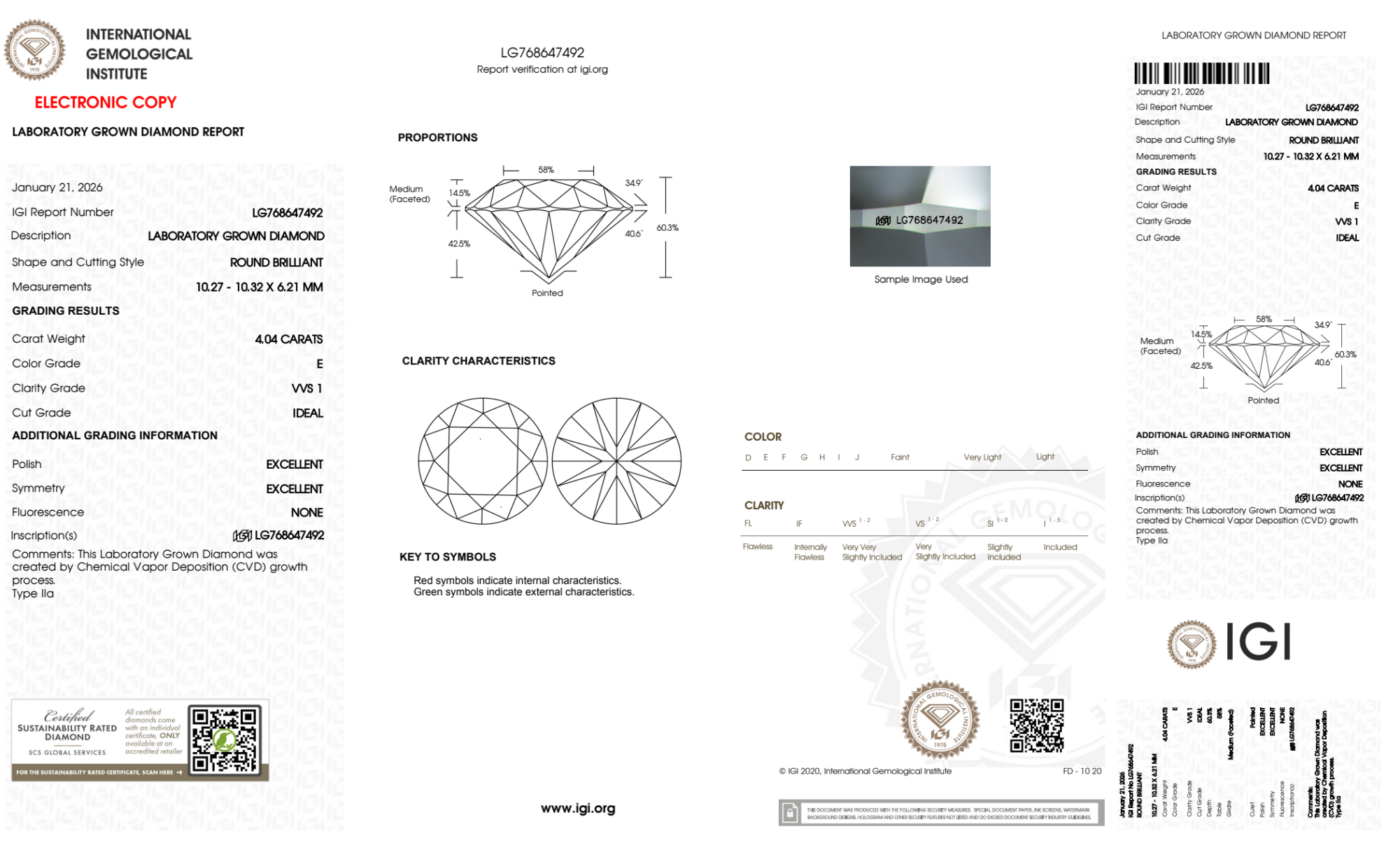 Your 4.04 carat Round lab diamond is graded E color (Colorless), and you can read more about E color diamonds here.