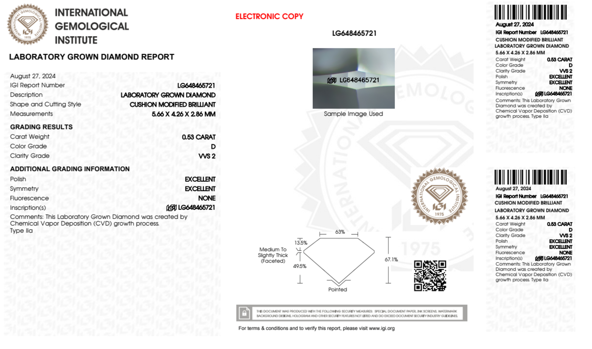 Your 0.53 carat Cushion lab diamond is graded D color (Colorless), and you can read more about D color diamonds here.