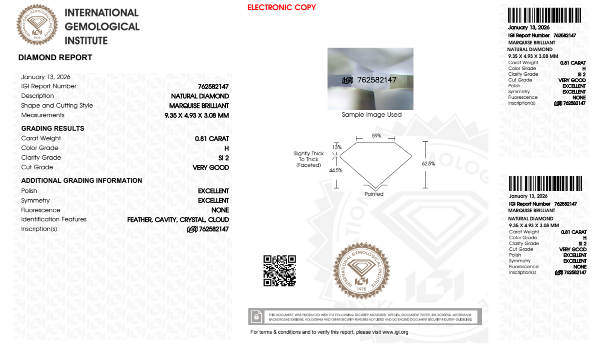 Your 0.81 carat Marquise natural diamond is graded SI2 clarity, which stands for Slightly Included 2. Read more about SI2 clarity diamonds here, or learn more about diamond clarity in general here.