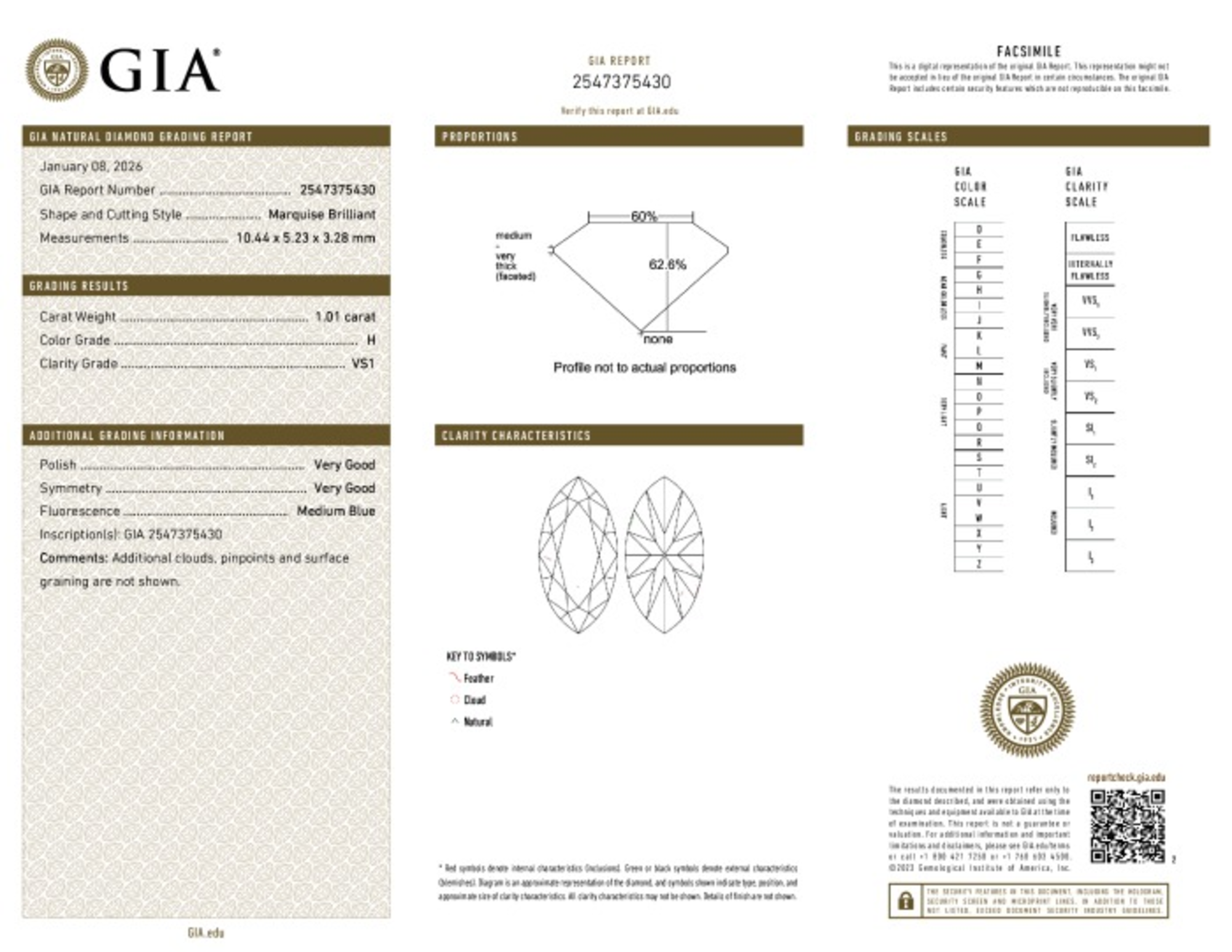 Your 1.01 carat Marquise natural diamond is graded H color (Near Colorless), and you can read more about H color diamonds here.