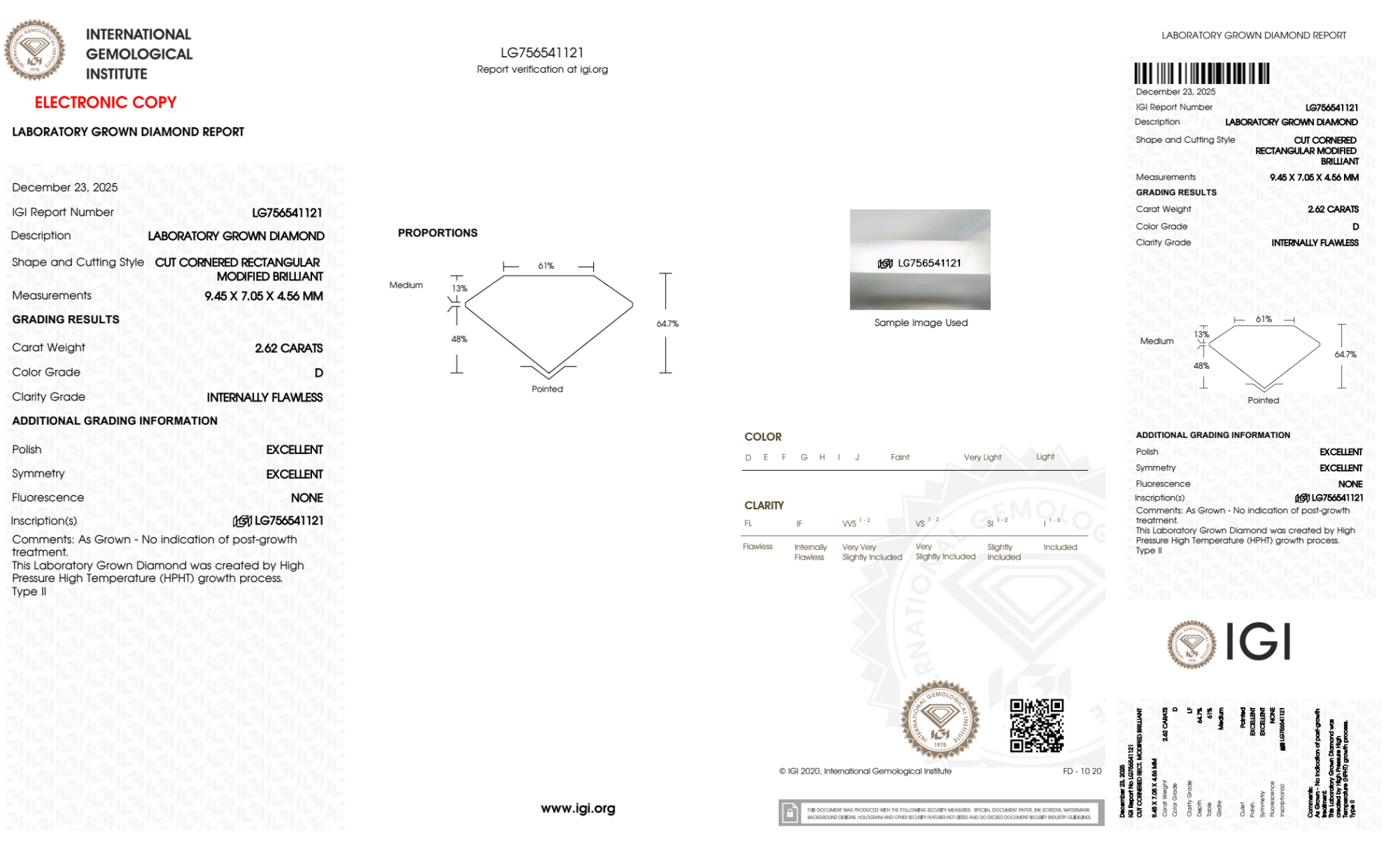 Your 2.62 carat Radiant lab diamond is graded D color (Colorless), and you can read more about D color diamonds here.