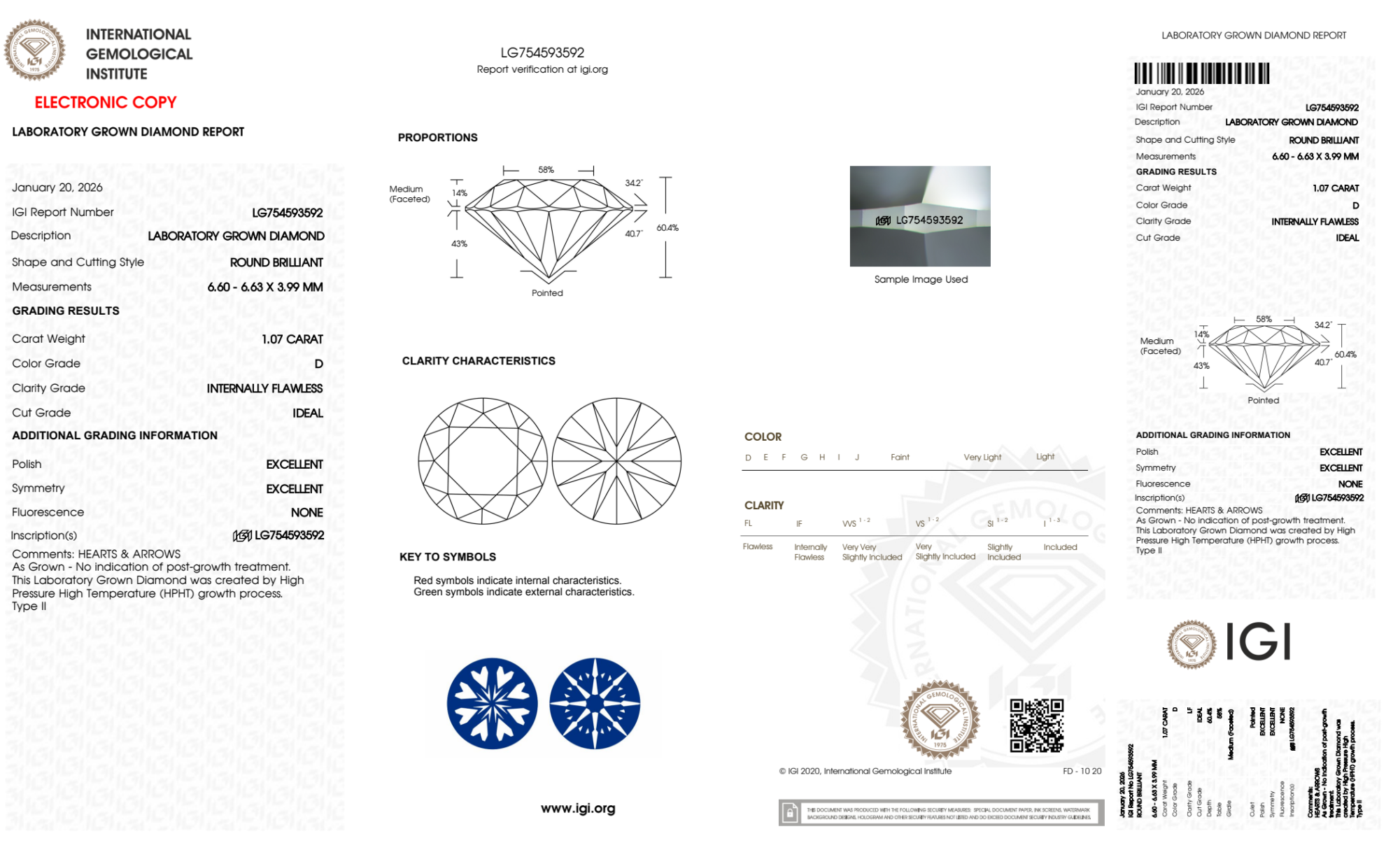 Your 1.07 carat Round lab diamond is graded IF clarity, which stands for Internally Flawless. Read more about IF clarity diamonds here, or learn more about diamond clarity in general here.