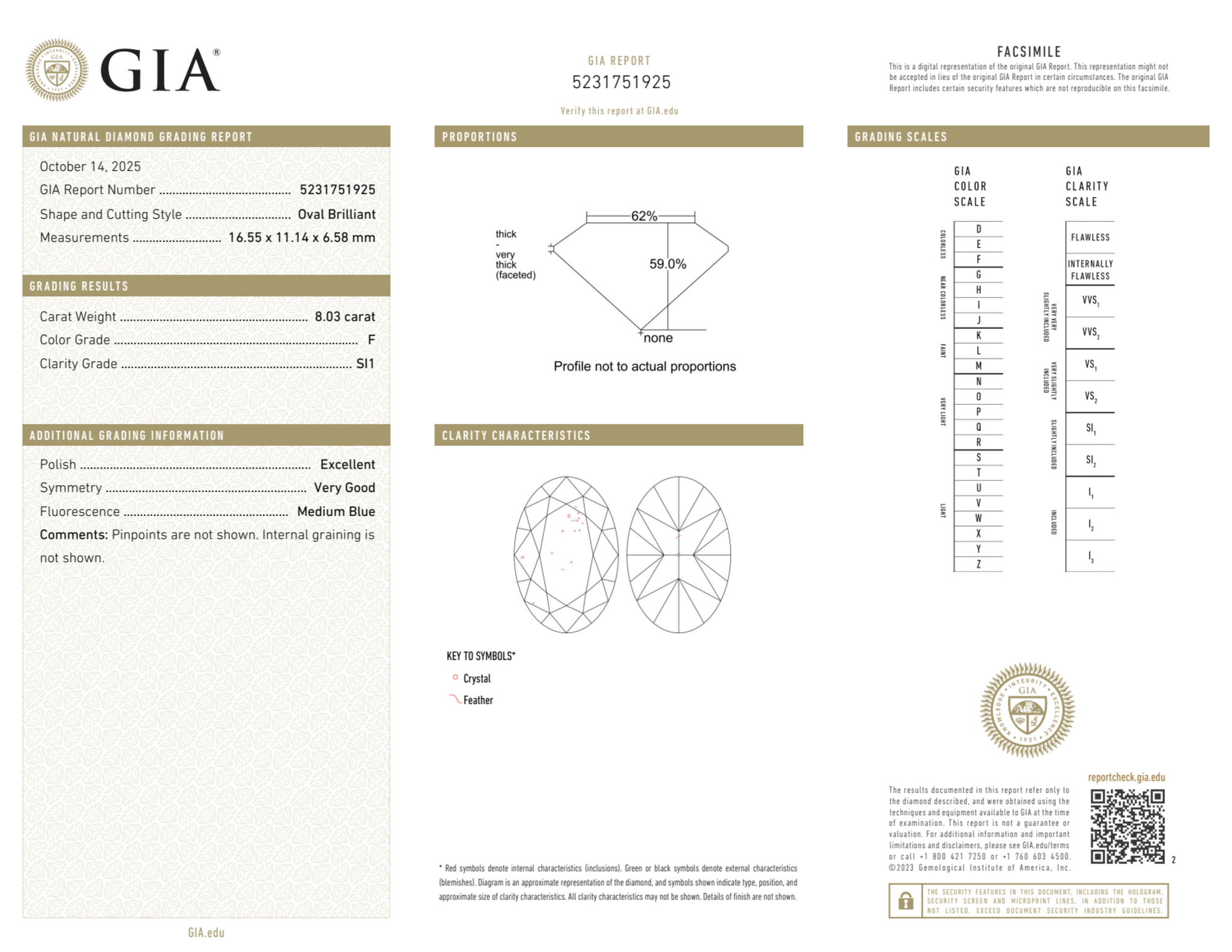 Your 8.03 carat Oval natural diamond is graded F color (Colorless), and you can read more about F color diamonds here.