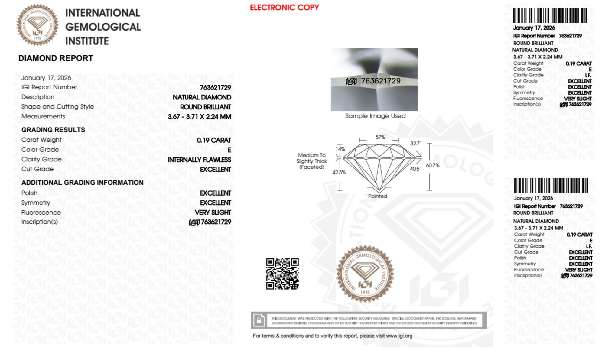 Your 0.19 carat Round natural diamond is graded IF clarity, which stands for Internally Flawless. Read more about IF clarity diamonds here, or learn more about diamond clarity in general here.