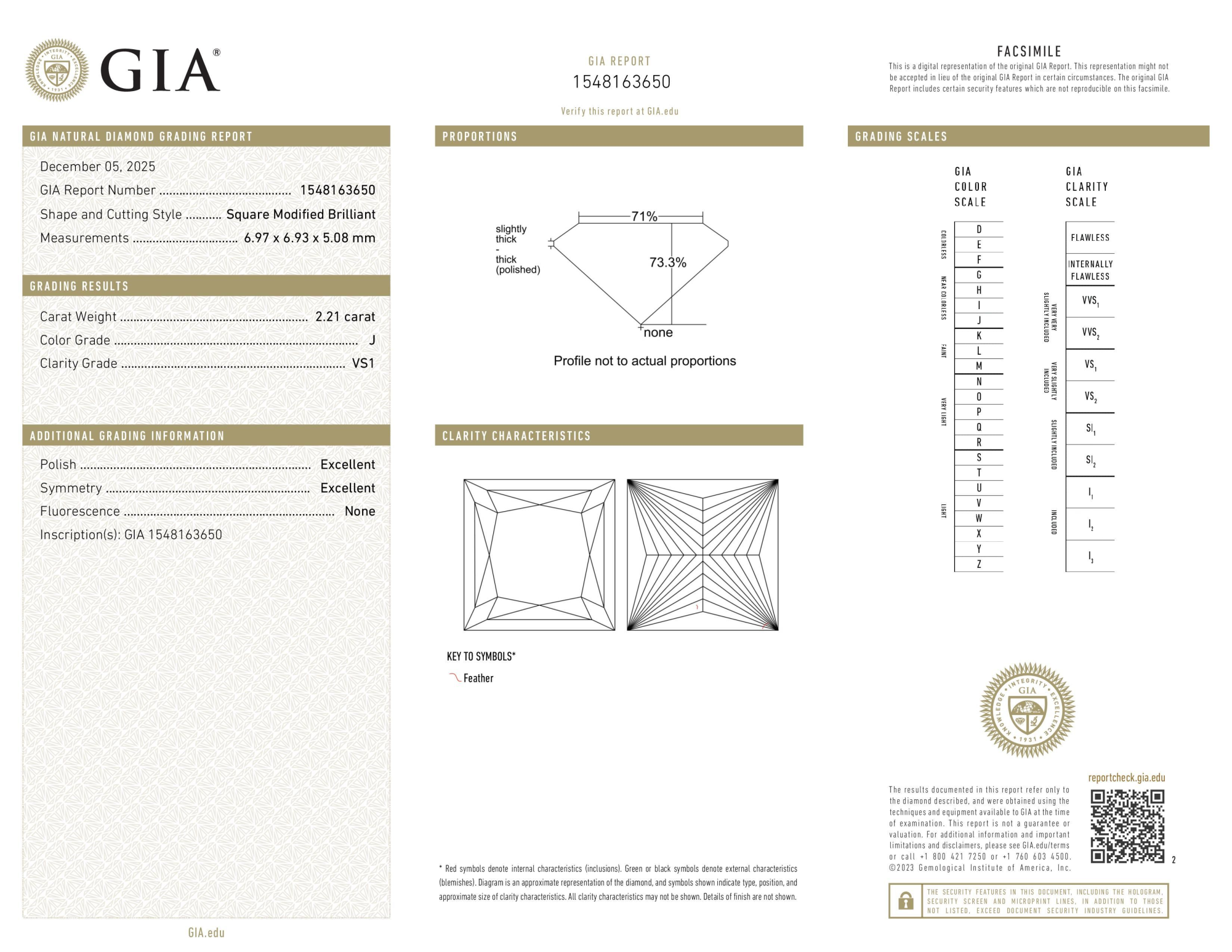 Your 2.21 carat Princess natural diamond is graded VS1 clarity, which stands for Very Slightly Included 1. Read more about VS1 clarity diamonds here, or learn more about diamond clarity in general here.