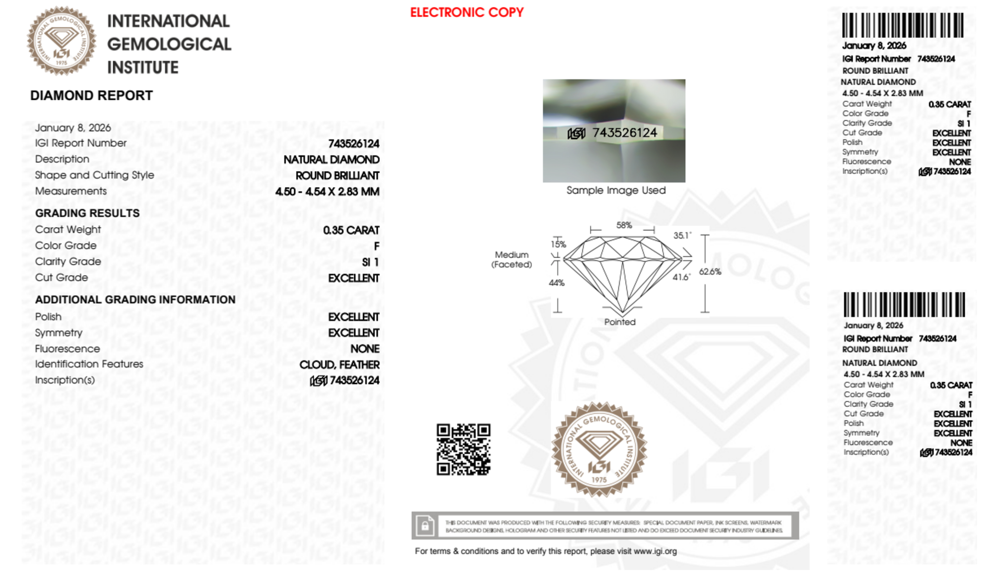 Your 0.35 carat Round natural diamond is graded SI1 clarity, which stands for Slightly Included 1. Read more about SI1 clarity diamonds here, or learn more about diamond clarity in general here.
