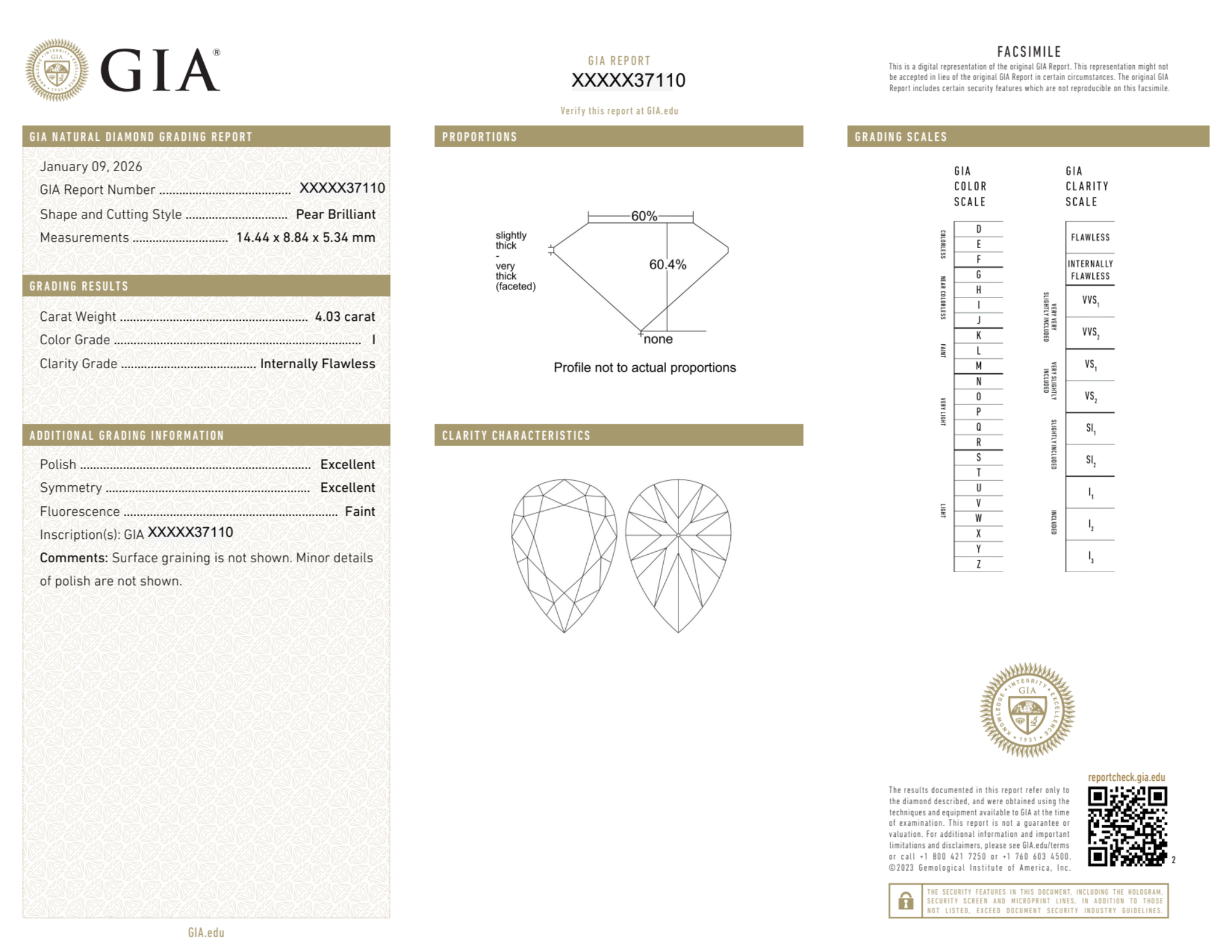 Your 4.03 carat Pear natural diamond is graded IF clarity, which stands for Internally Flawless. Read more about IF clarity diamonds here, or learn more about diamond clarity in general here.