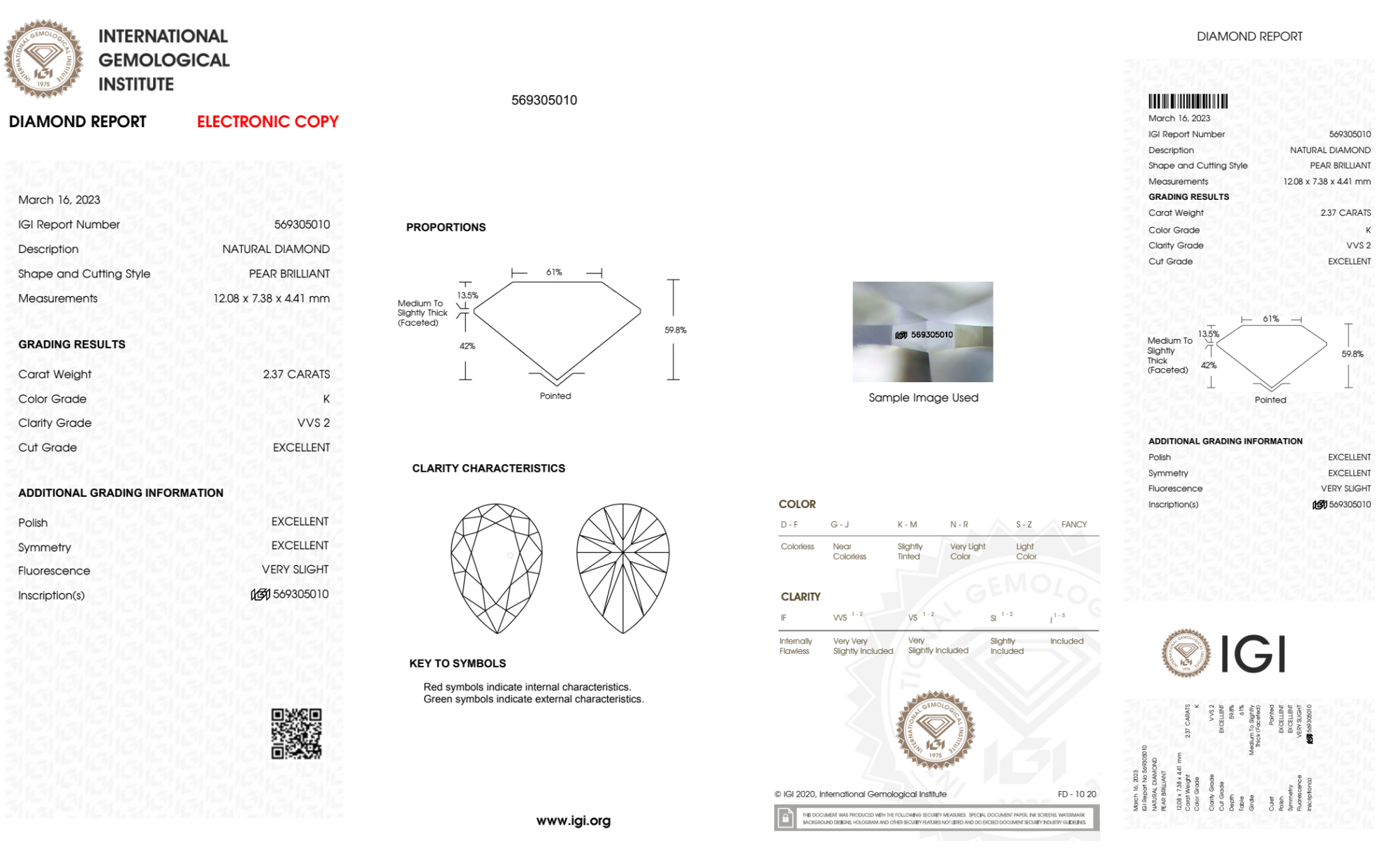 Your 2.37 carat Pear natural diamond is graded K color (Faint Color), and you can read more about K color diamonds here.