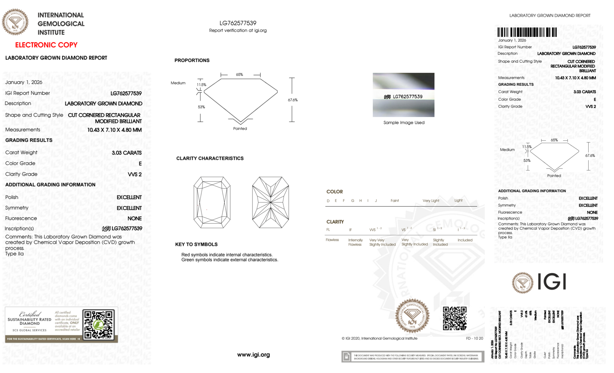 Your 3.03 carat Radiant lab diamond is graded E color (Colorless), and you can read more about E color diamonds here.