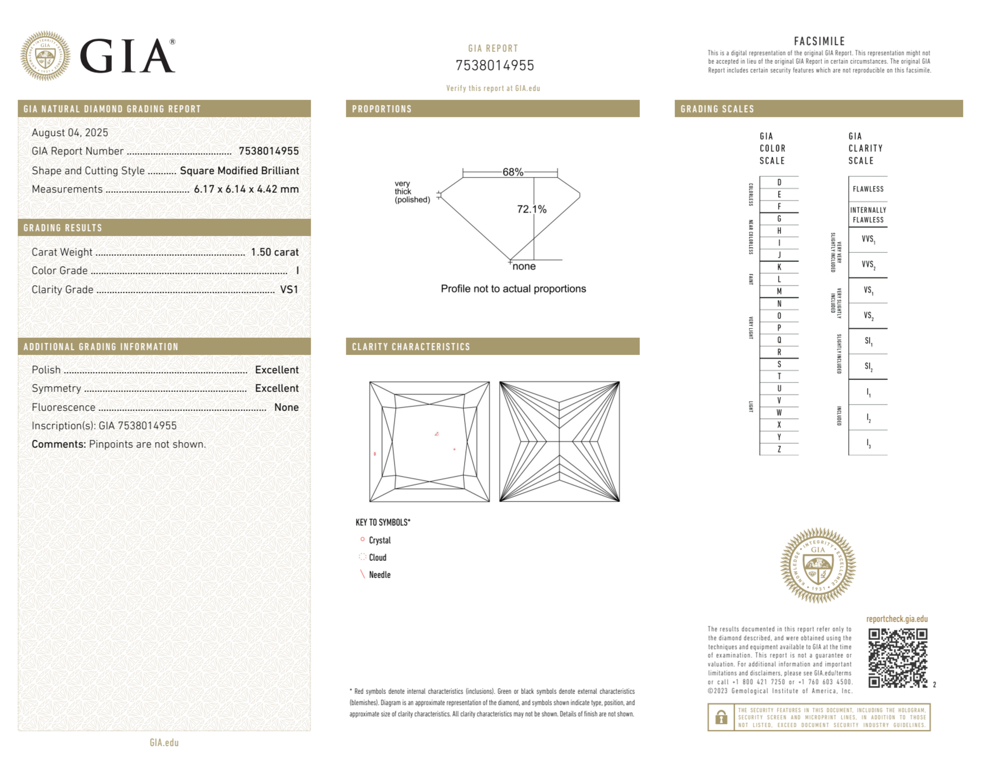Your 1.50 carat Princess natural diamond is graded VS1 clarity, which stands for Very Slightly Included 1. Read more about VS1 clarity diamonds here, or learn more about diamond clarity in general here.