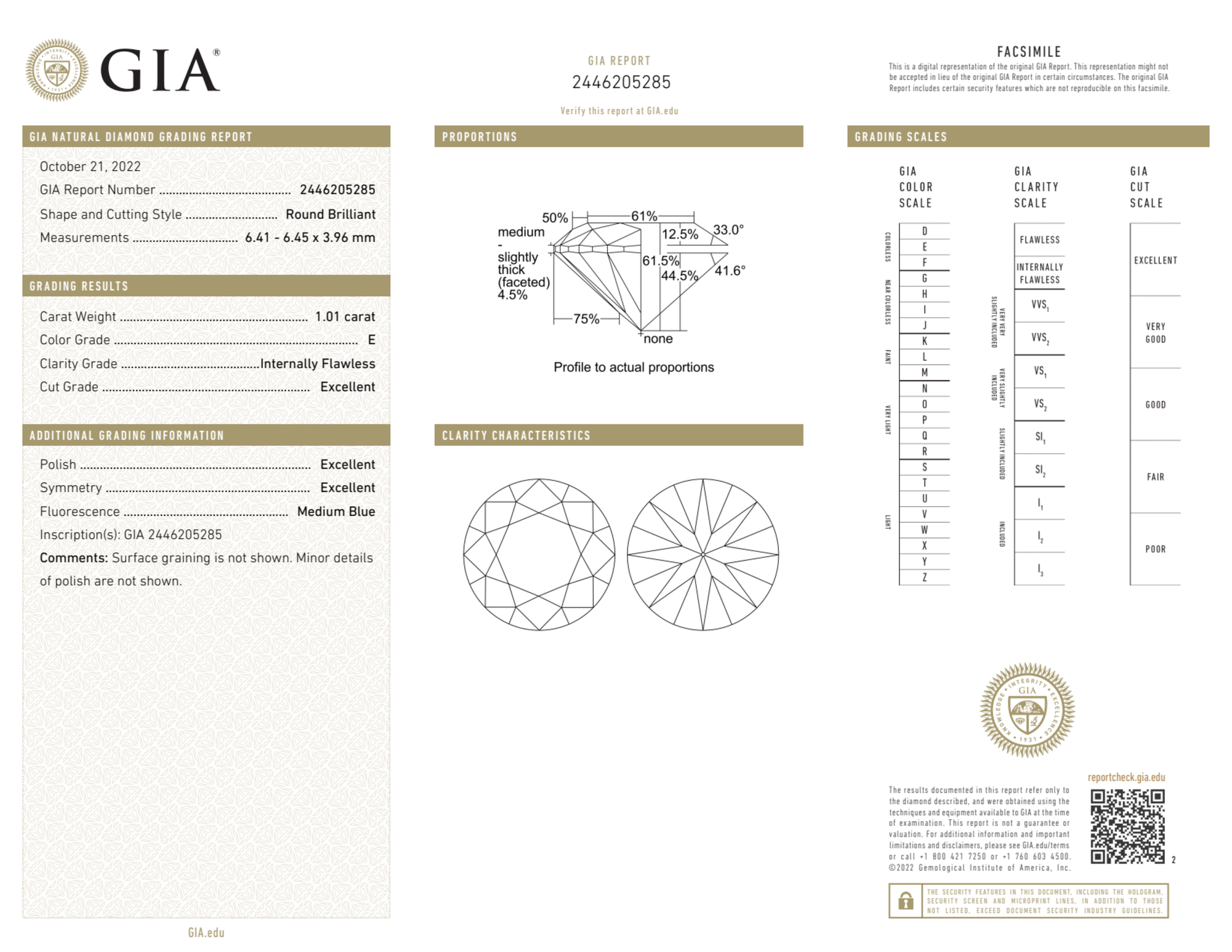 Your 1.01 carat Round natural diamond is graded E color (Colorless), and you can read more about E color diamonds here.