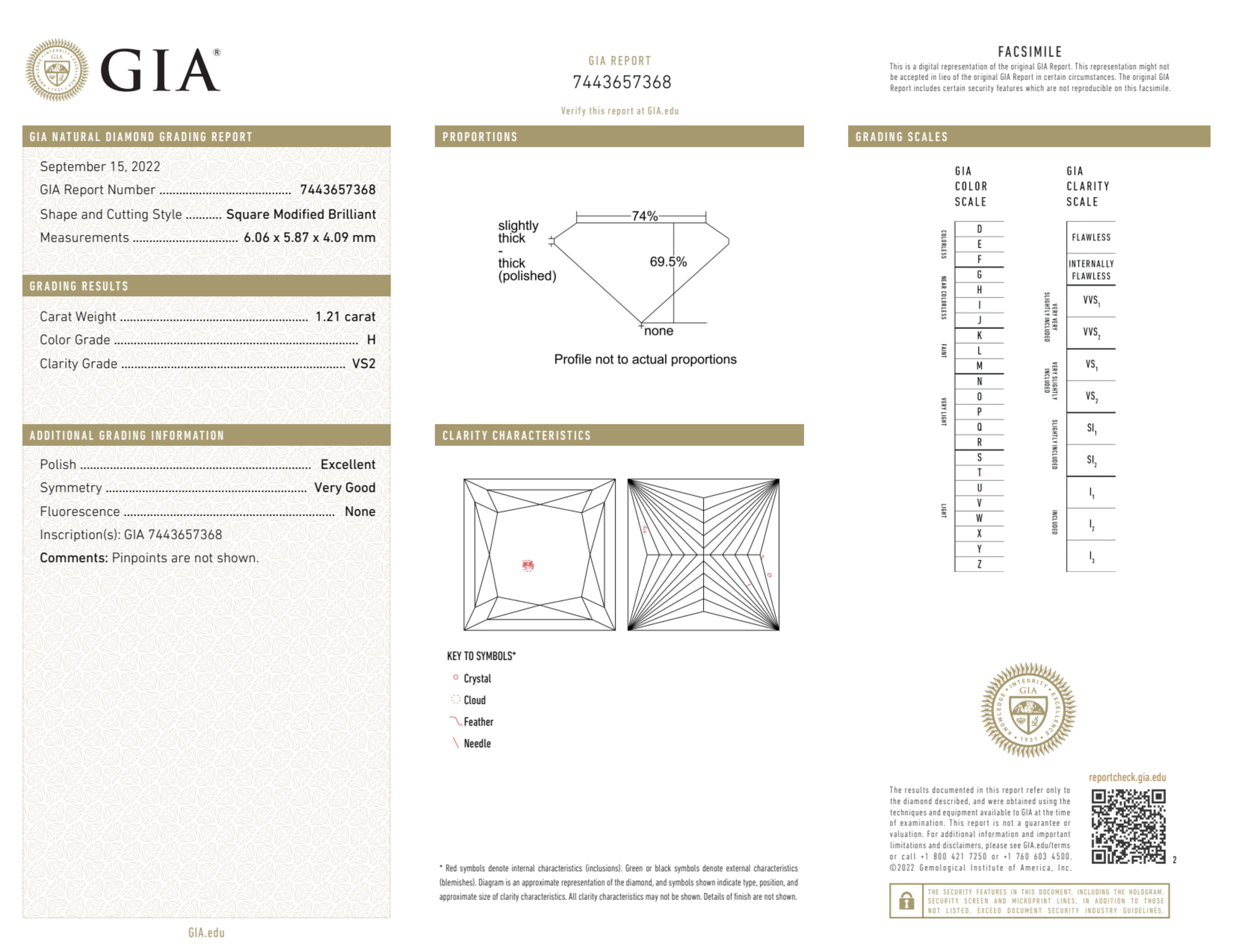 Your 1.21 carat Princess natural diamond is graded VS2 clarity, which stands for Very Slightly Included 2. Read more about VS2 clarity diamonds here, or learn more about diamond clarity in general here.