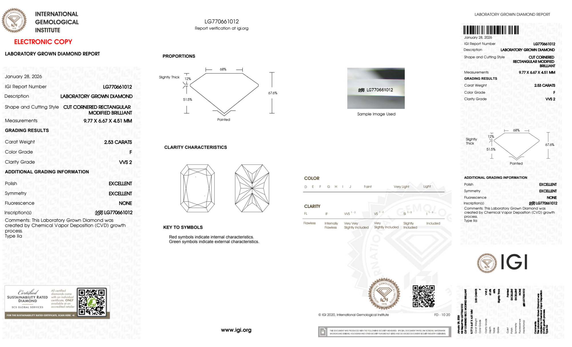Your 2.53 carat Radiant lab diamond is graded F color (Colorless), and you can read more about F color diamonds here.