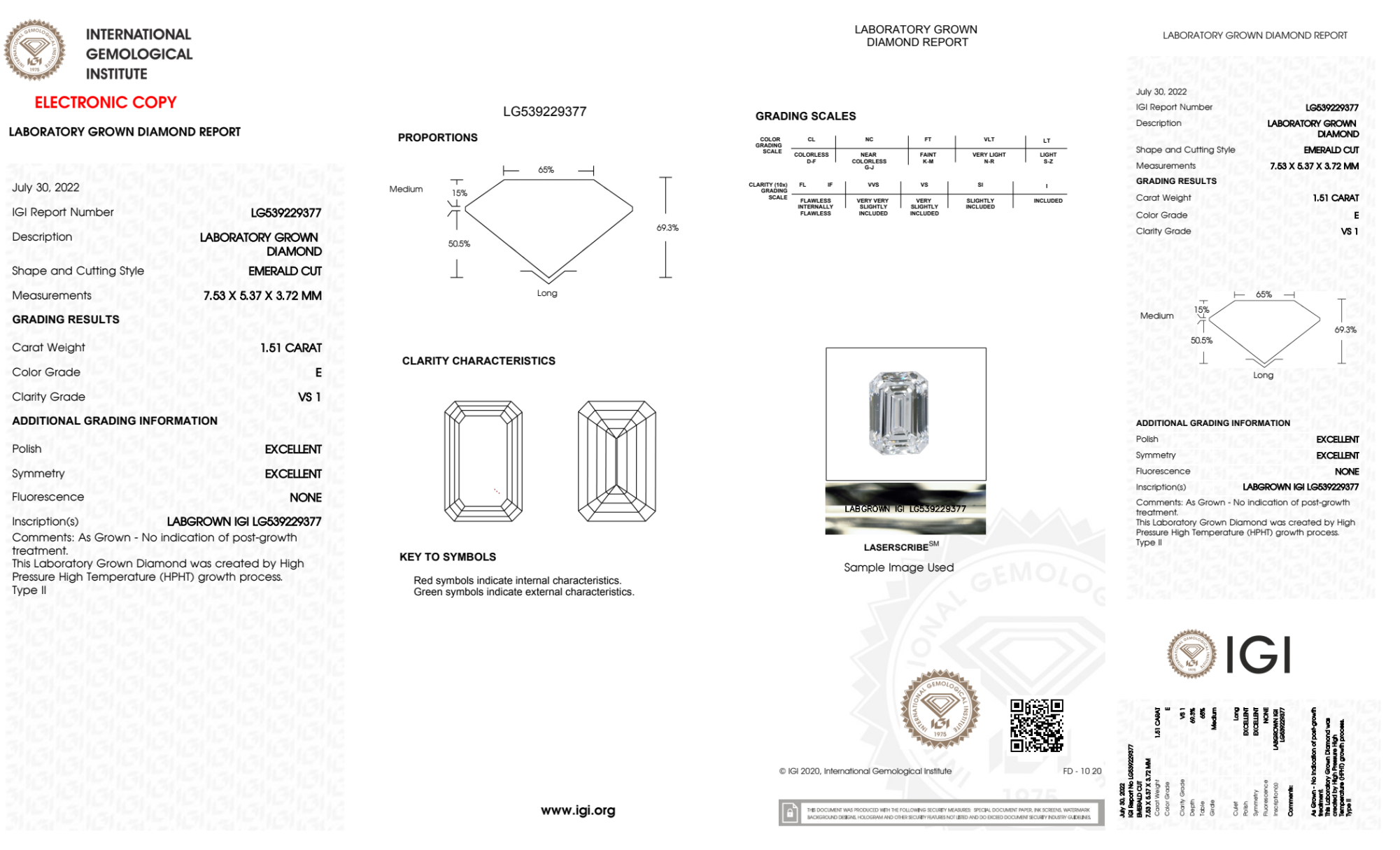 Your 1.51 carat Emerald lab diamond is graded E color (Colorless), and you can read more about E color diamonds here.