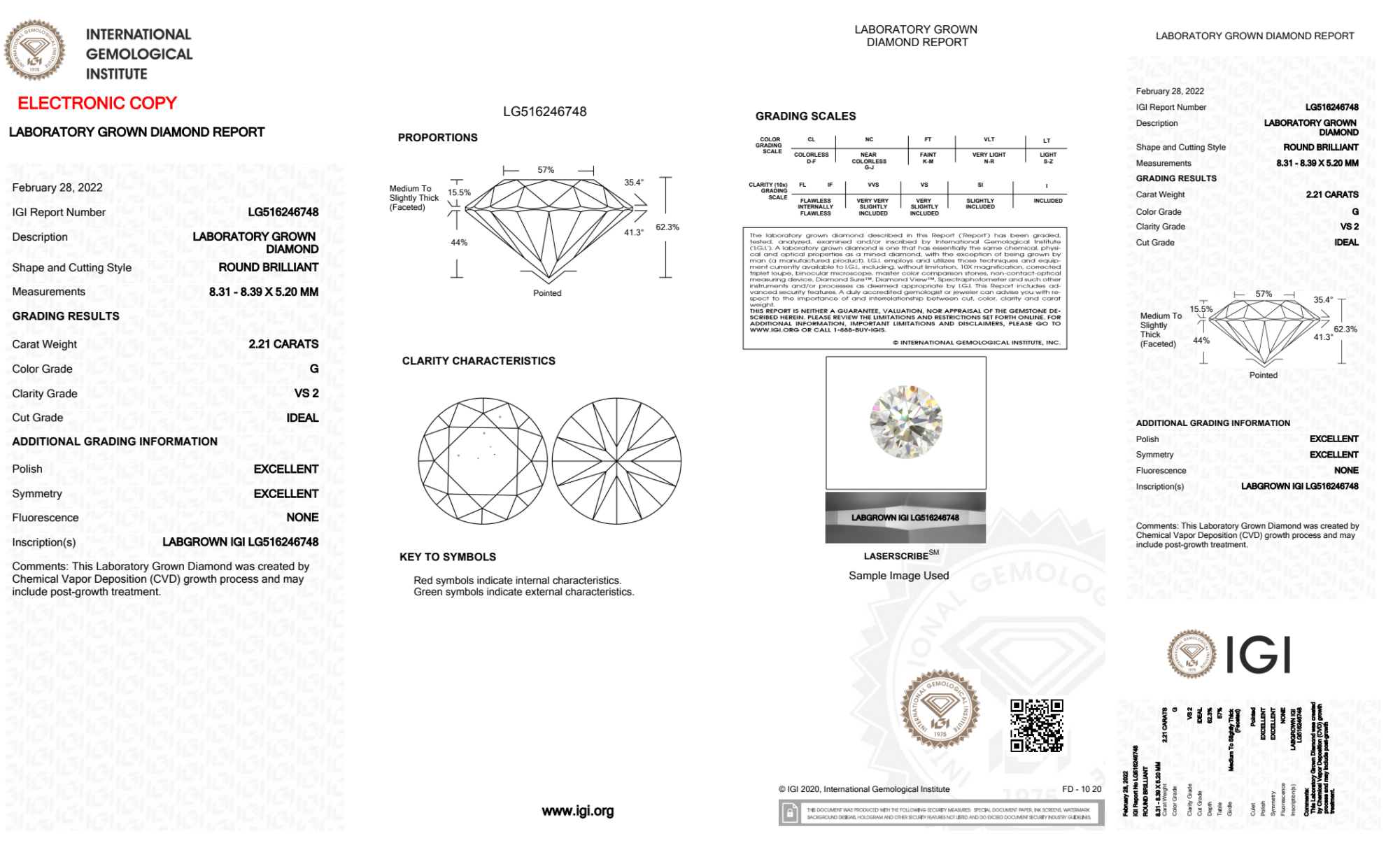 Your 2.21 carat Round lab diamond is graded G color (Near Colorless), and you can read more about G color diamonds here.