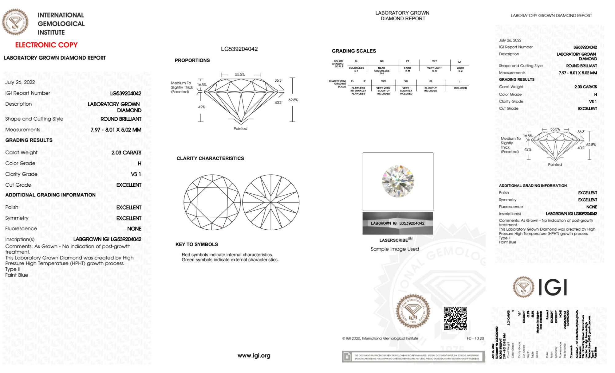 Your 2.03 carat Round lab diamond is graded H color (Near Colorless), and you can read more about H color diamonds here.