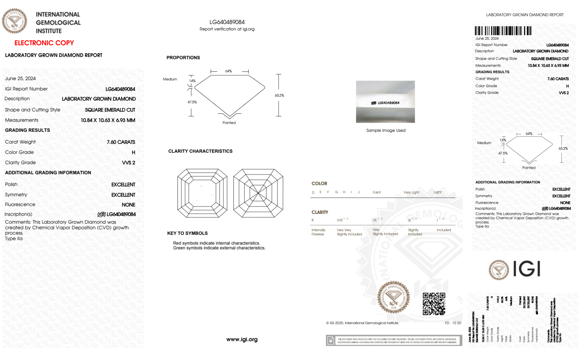 Your 7.60 carat Asscher lab diamond is graded VVS2 clarity, which stands for Very Very Slightly Included 2. Read more about VVS2 clarity diamonds here, or learn more about diamond clarity in general here.