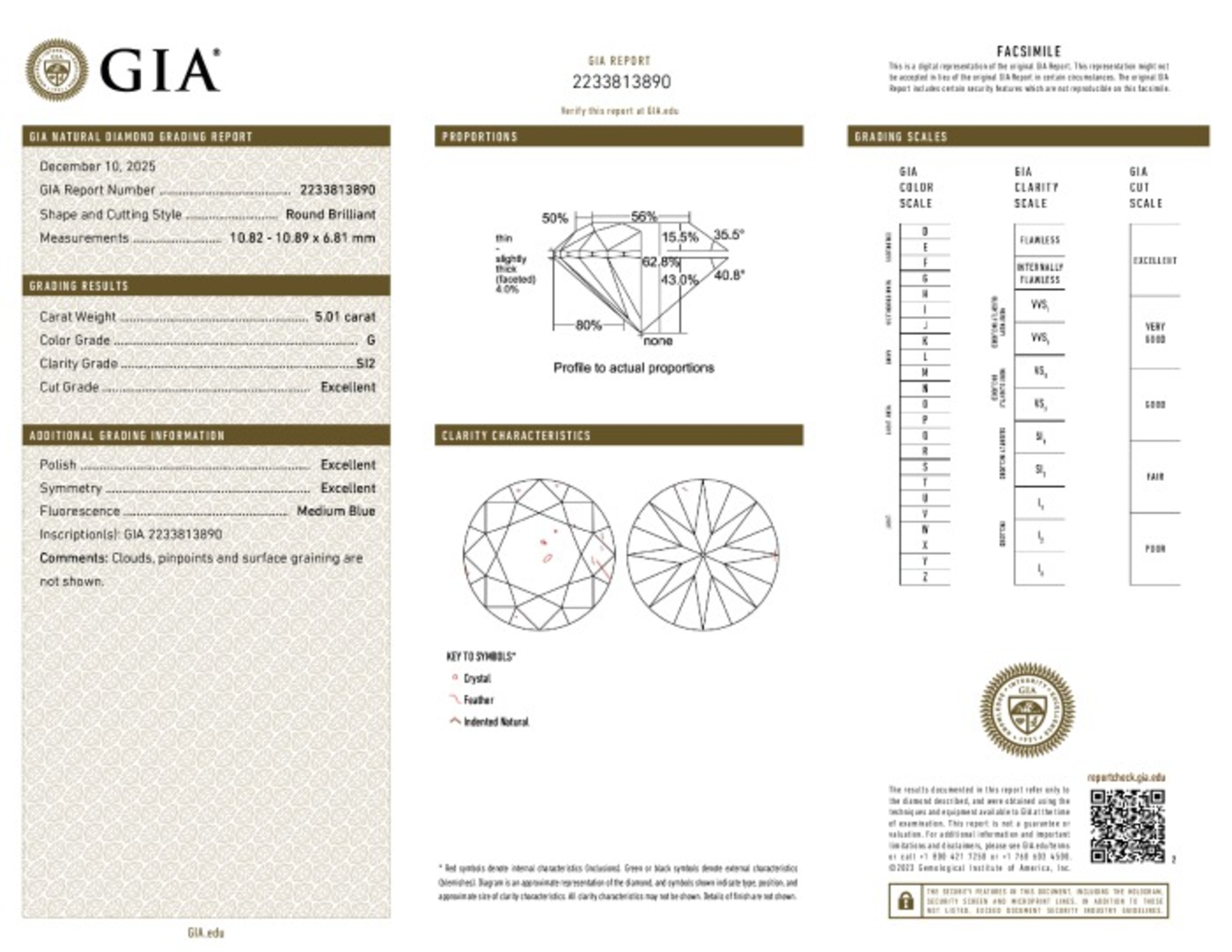 Your 5.01 carat Round natural diamond is graded SI2 clarity, which stands for Slightly Included 2. Read more about SI2 clarity diamonds here, or learn more about diamond clarity in general here.