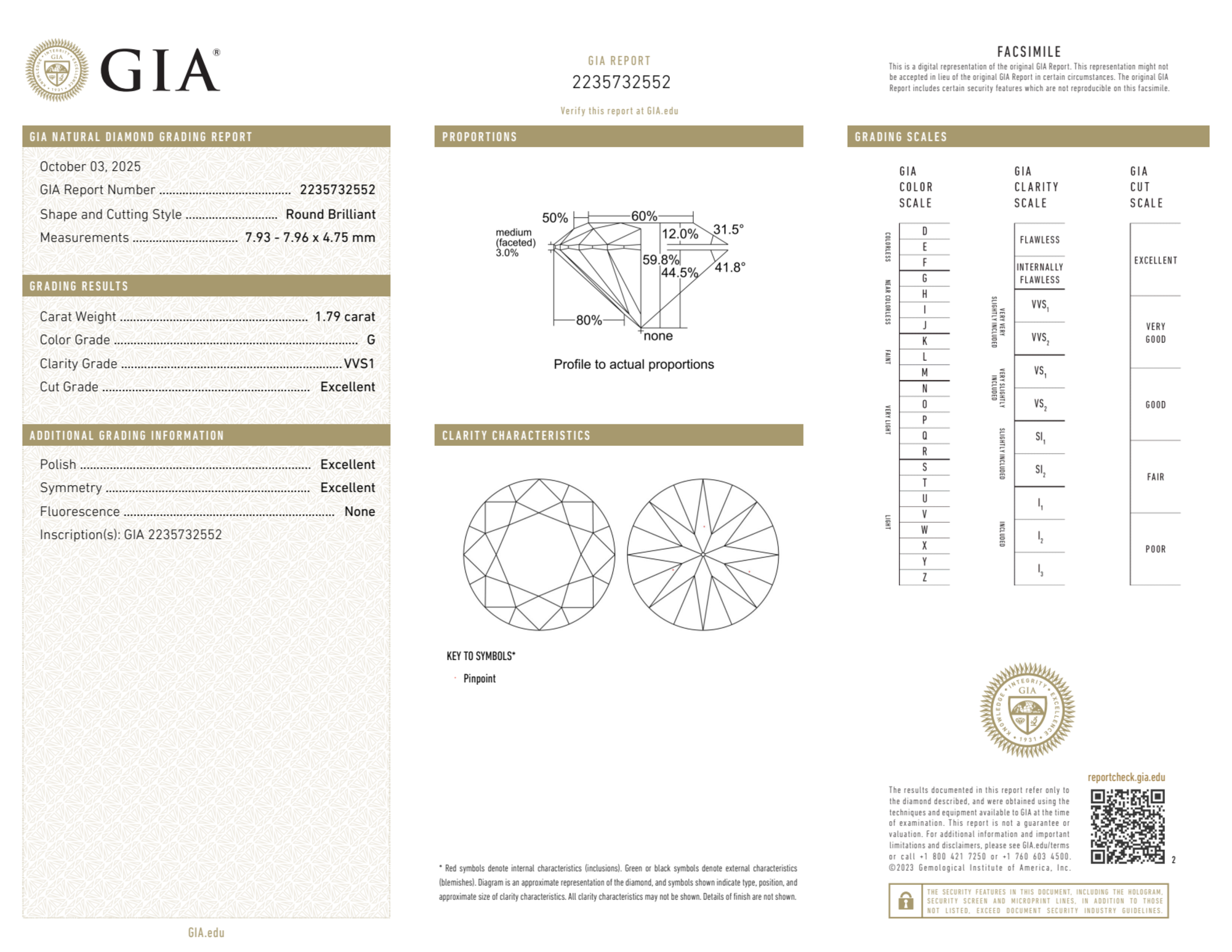Your 1.79 carat Round natural diamond is graded VVS1 clarity, which stands for Very Very Slightly Included 1. Read more about VVS1 clarity diamonds here, or learn more about diamond clarity in general here.