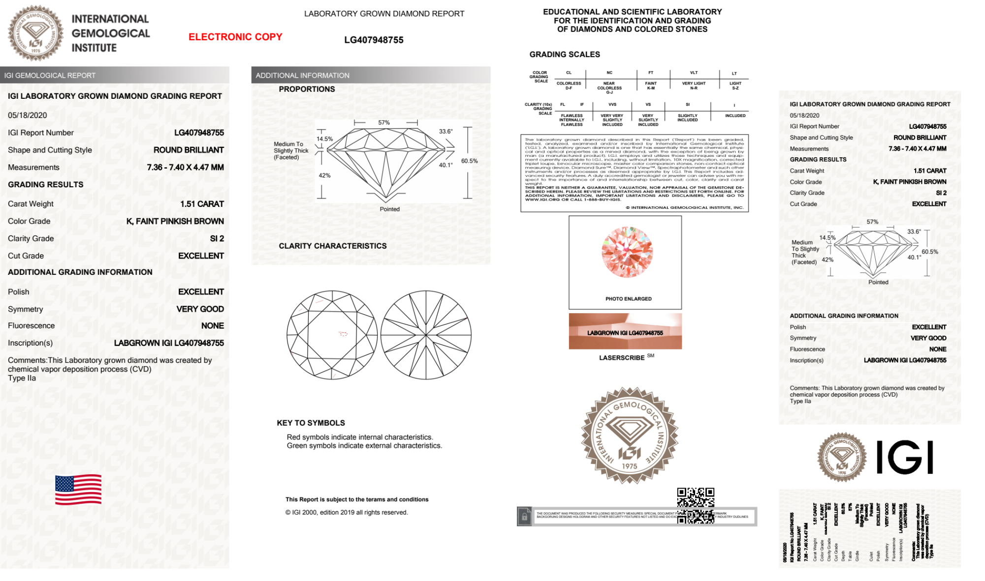 Your 1.51 carat Round lab diamond is graded SI2 clarity, which stands for Slightly Included 2. Read more about SI2 clarity diamonds here, or learn more about diamond clarity in general here.
