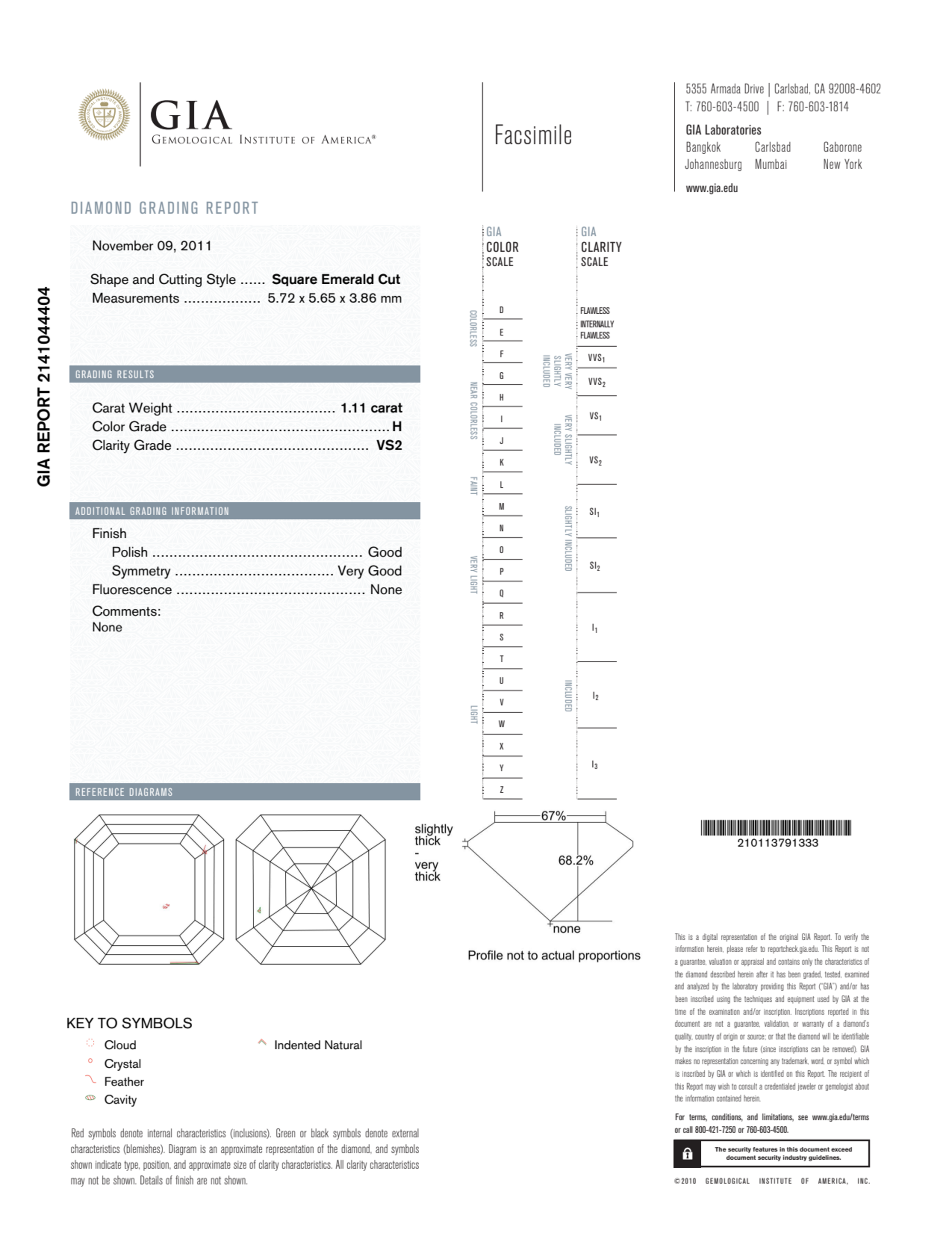 Your 1.11 carat Asscher natural diamond is graded VS2 clarity, which stands for Very Slightly Included 2. Read more about VS2 clarity diamonds here, or learn more about diamond clarity in general here.