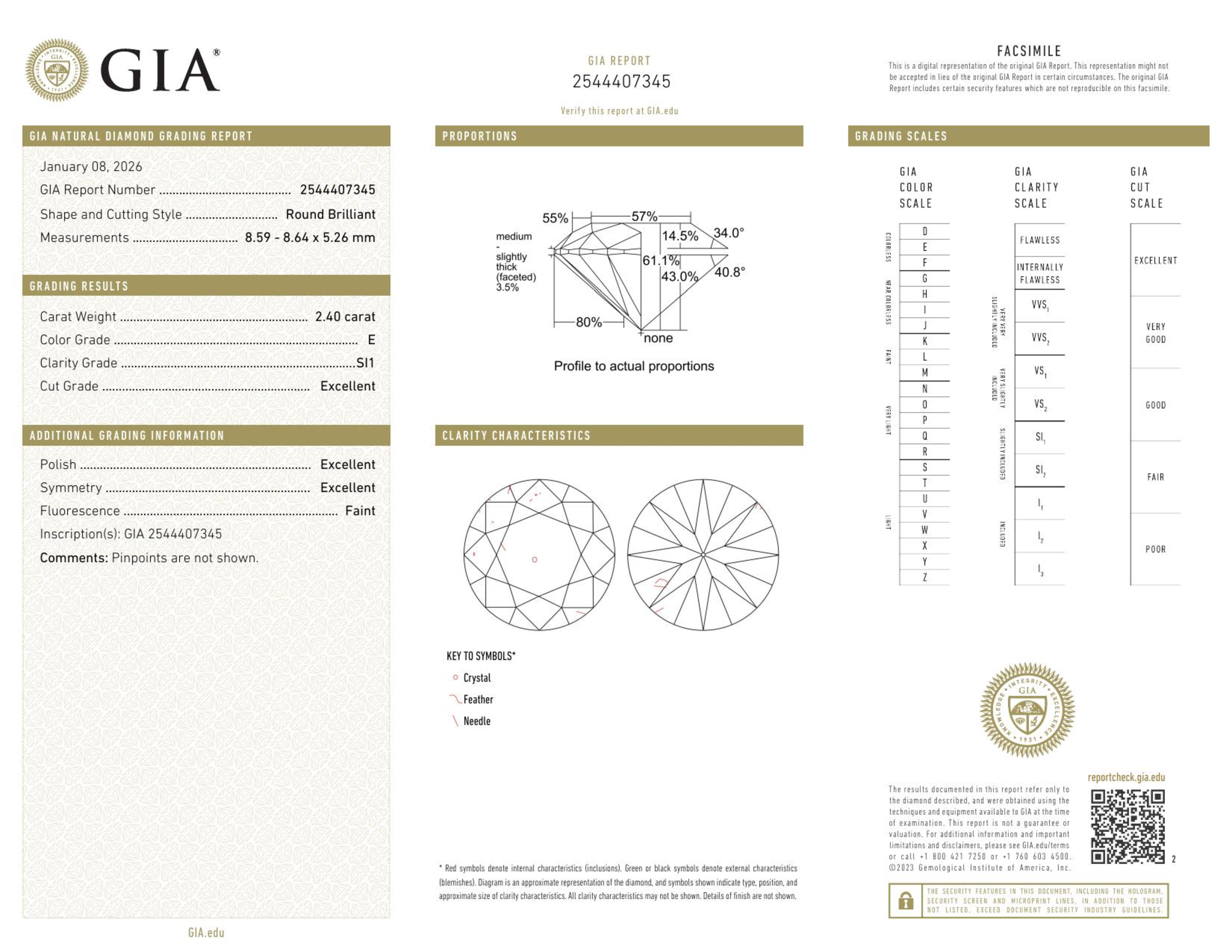Your 2.40 carat Round natural diamond is graded E color (Colorless), and you can read more about E color diamonds here.