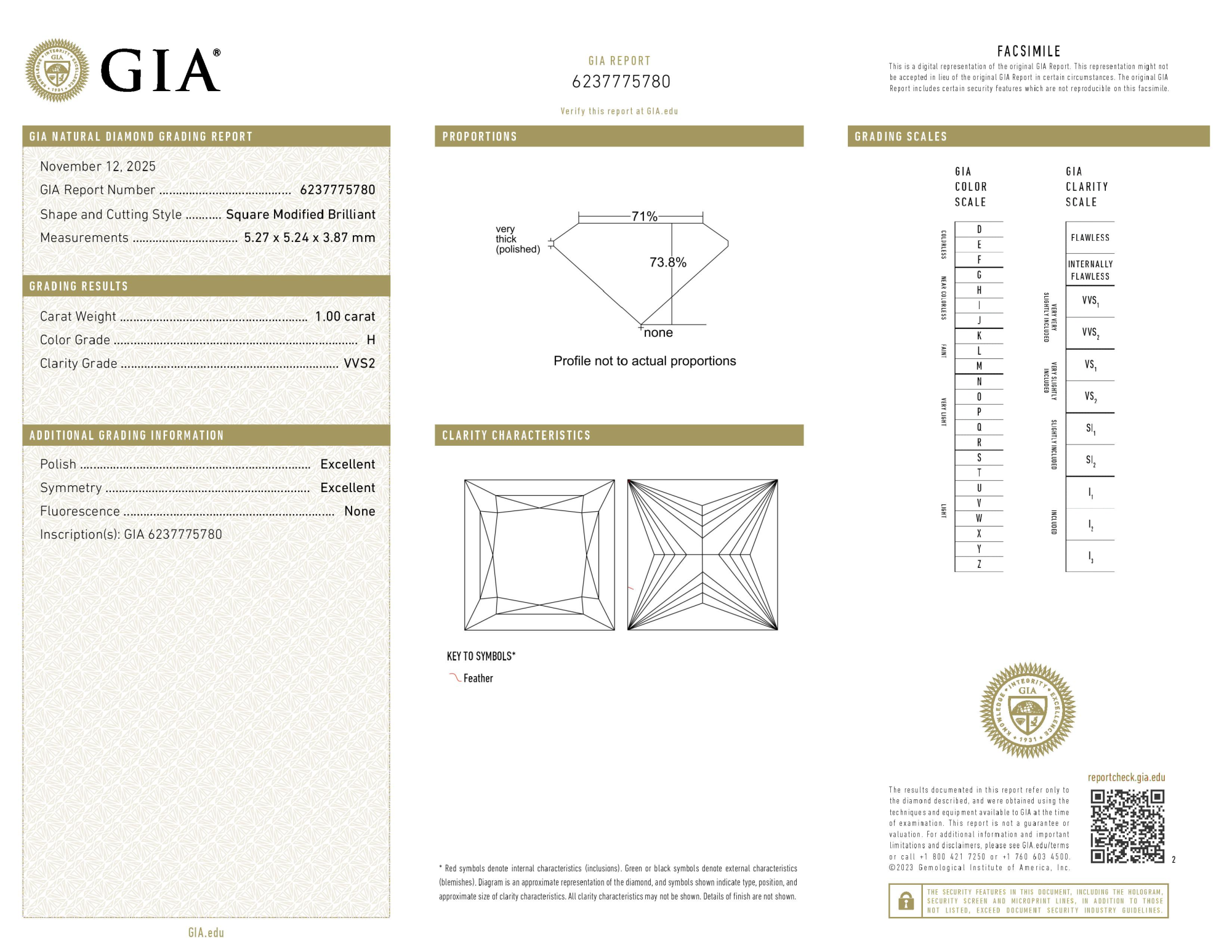Your 1.00 carat Princess natural diamond is graded VVS2 clarity, which stands for Very Very Slightly Included 2. Read more about VVS2 clarity diamonds here, or learn more about diamond clarity in general here.