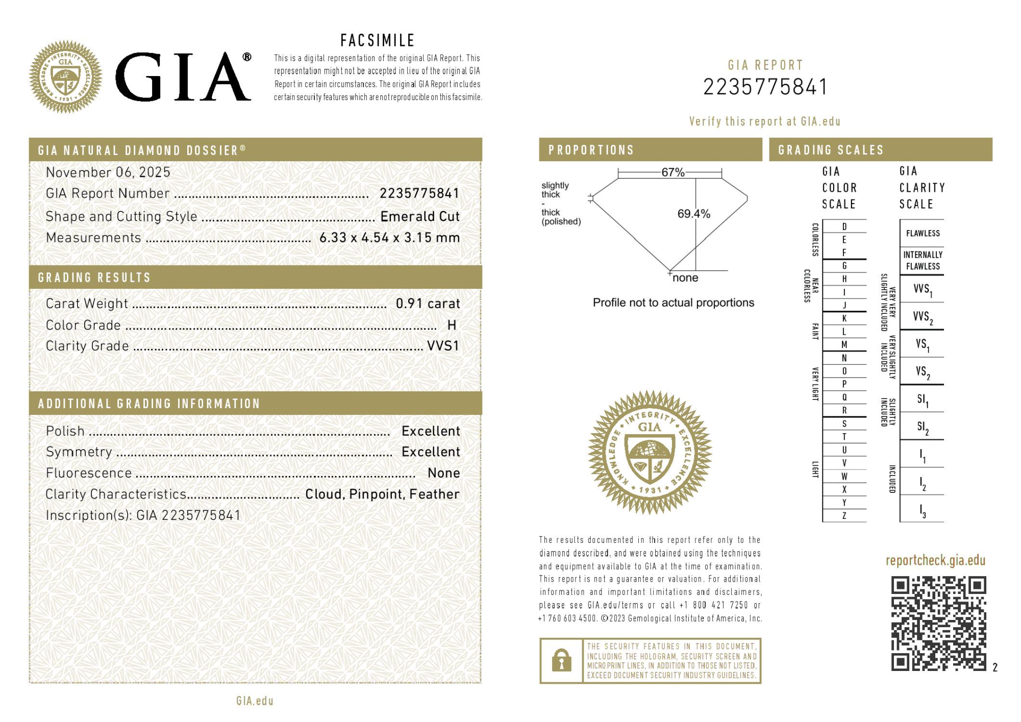 Your 0.91 carat Emerald natural diamond is graded VVS1 clarity, which stands for Very Very Slightly Included 1. Read more about VVS1 clarity diamonds here, or learn more about diamond clarity in general here.