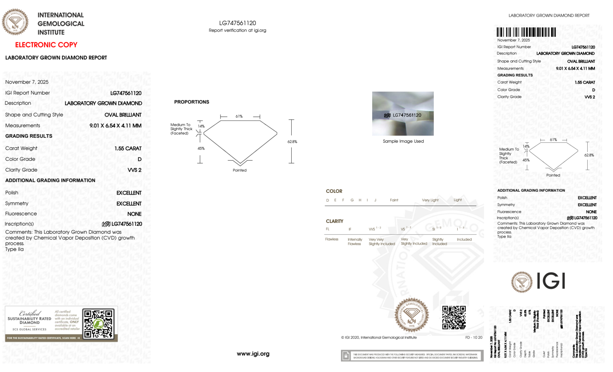 Your 1.55 carat Oval lab diamond is graded D color (Colorless), and you can read more about D color diamonds here.