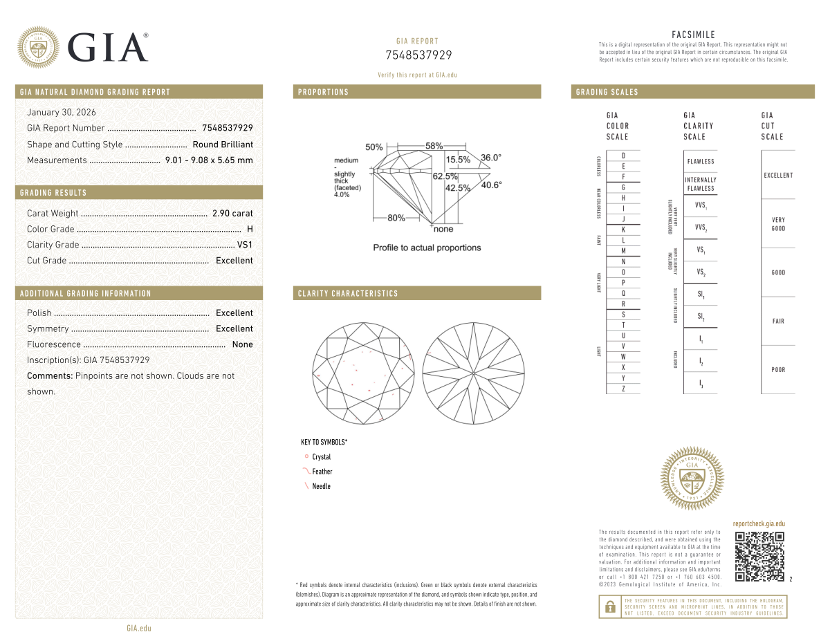 Your 2.90 carat Round natural diamond is graded VS1 clarity, which stands for Very Slightly Included 1. Read more about VS1 clarity diamonds here, or learn more about diamond clarity in general here.