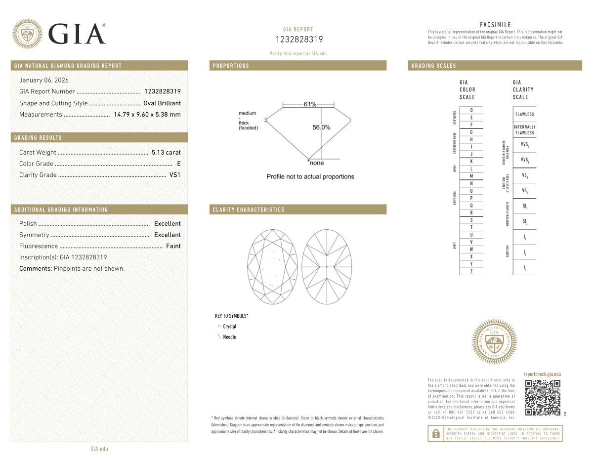 Your 5.13 carat Oval natural diamond is graded VS1 clarity, which stands for Very Slightly Included 1. Read more about VS1 clarity diamonds here, or learn more about diamond clarity in general here.