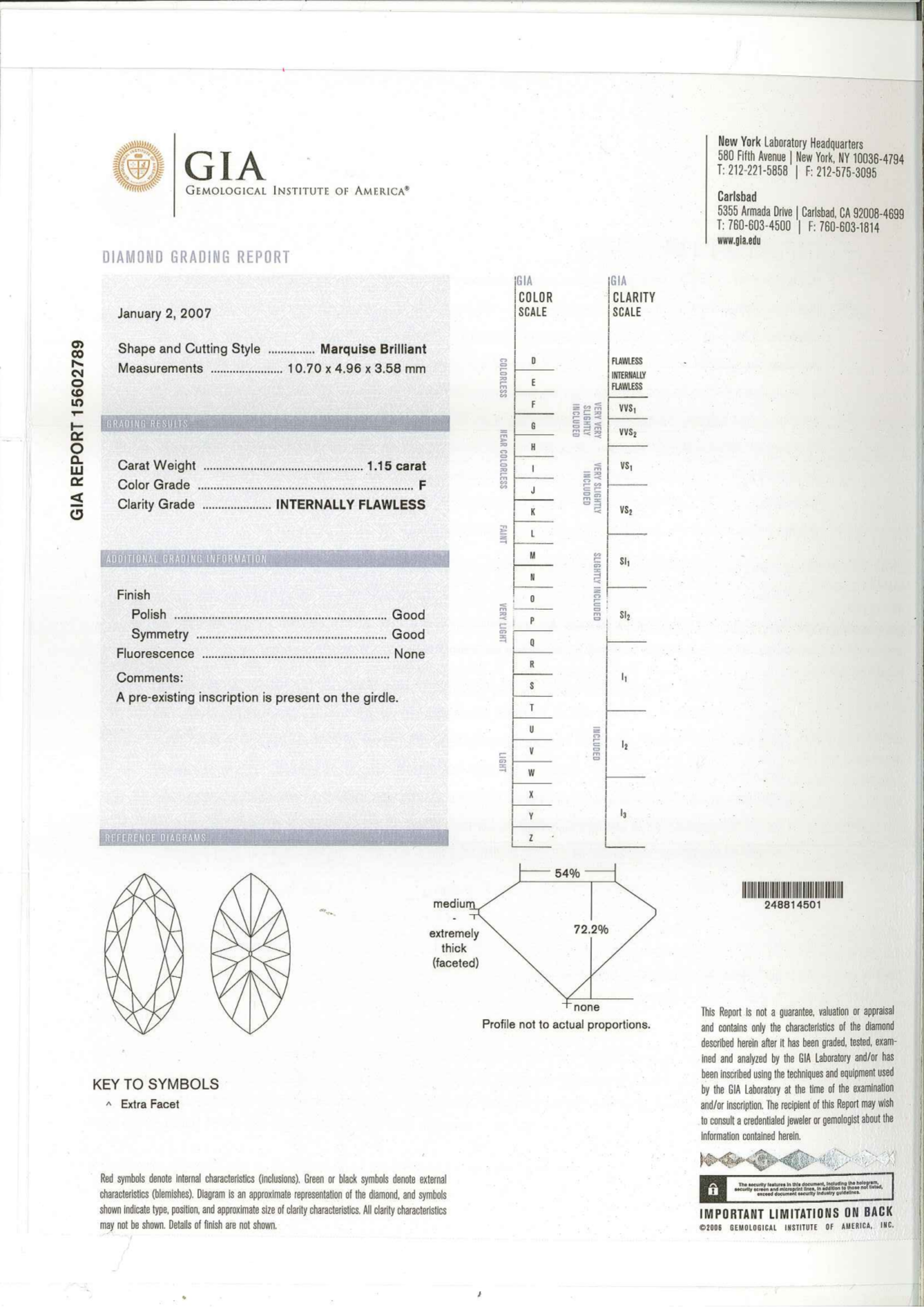 Your 1.15 carat Marquise natural diamond is graded IF clarity, which stands for Internally Flawless. Read more about IF clarity diamonds here, or learn more about diamond clarity in general here.