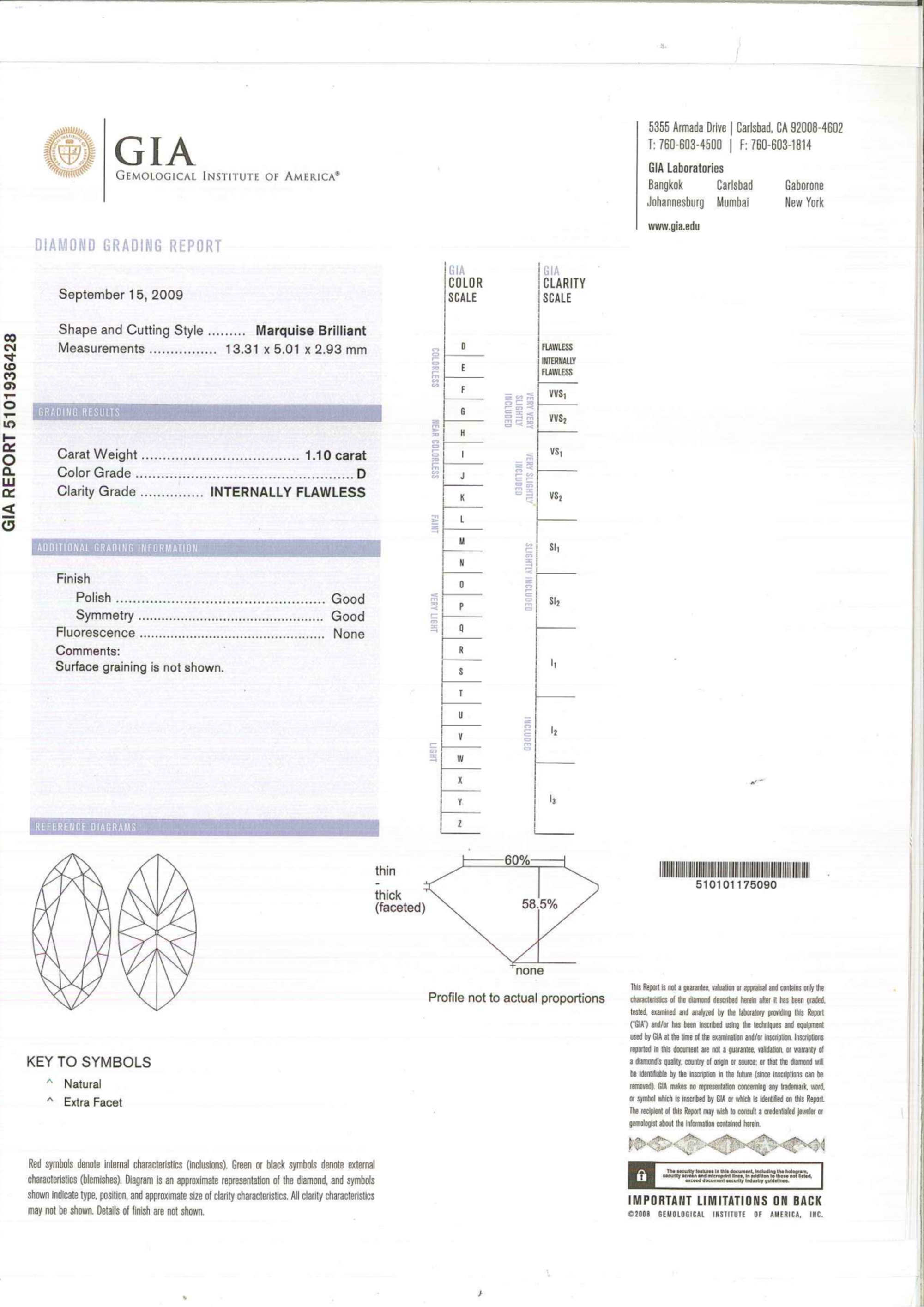 Your 1.10 carat Marquise natural diamond is graded D color (Colorless), and you can read more about D color diamonds here.