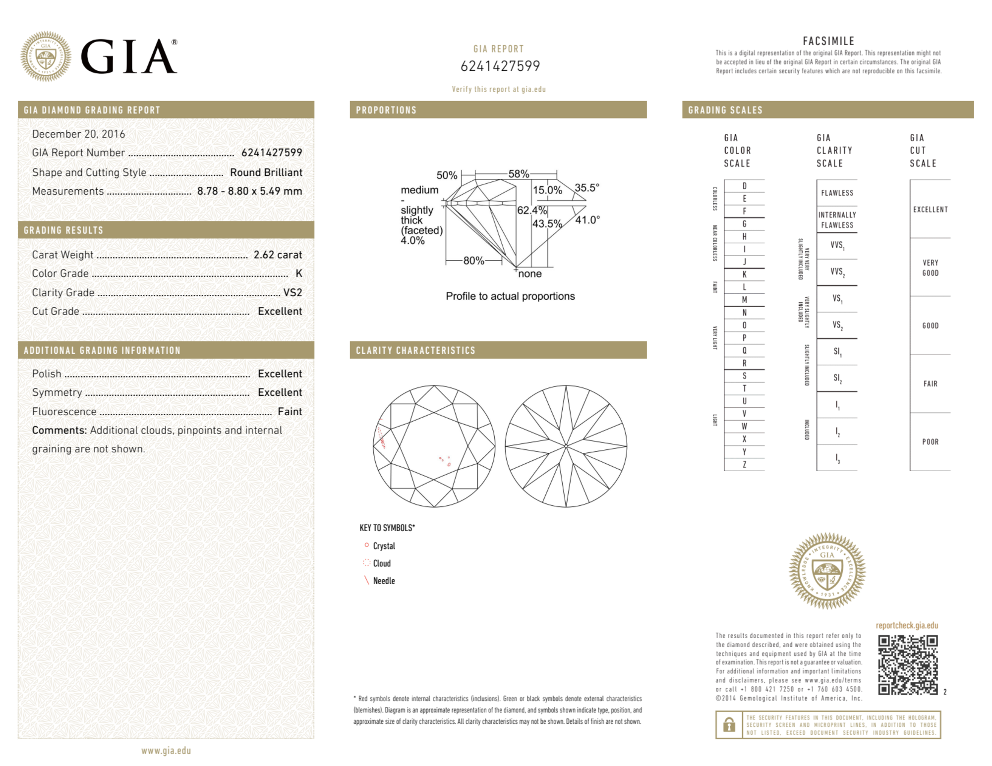 Your 2.62 carat Round natural diamond is graded VS2 clarity, which stands for Very Slightly Included 2. Read more about VS2 clarity diamonds here, or learn more about diamond clarity in general here.