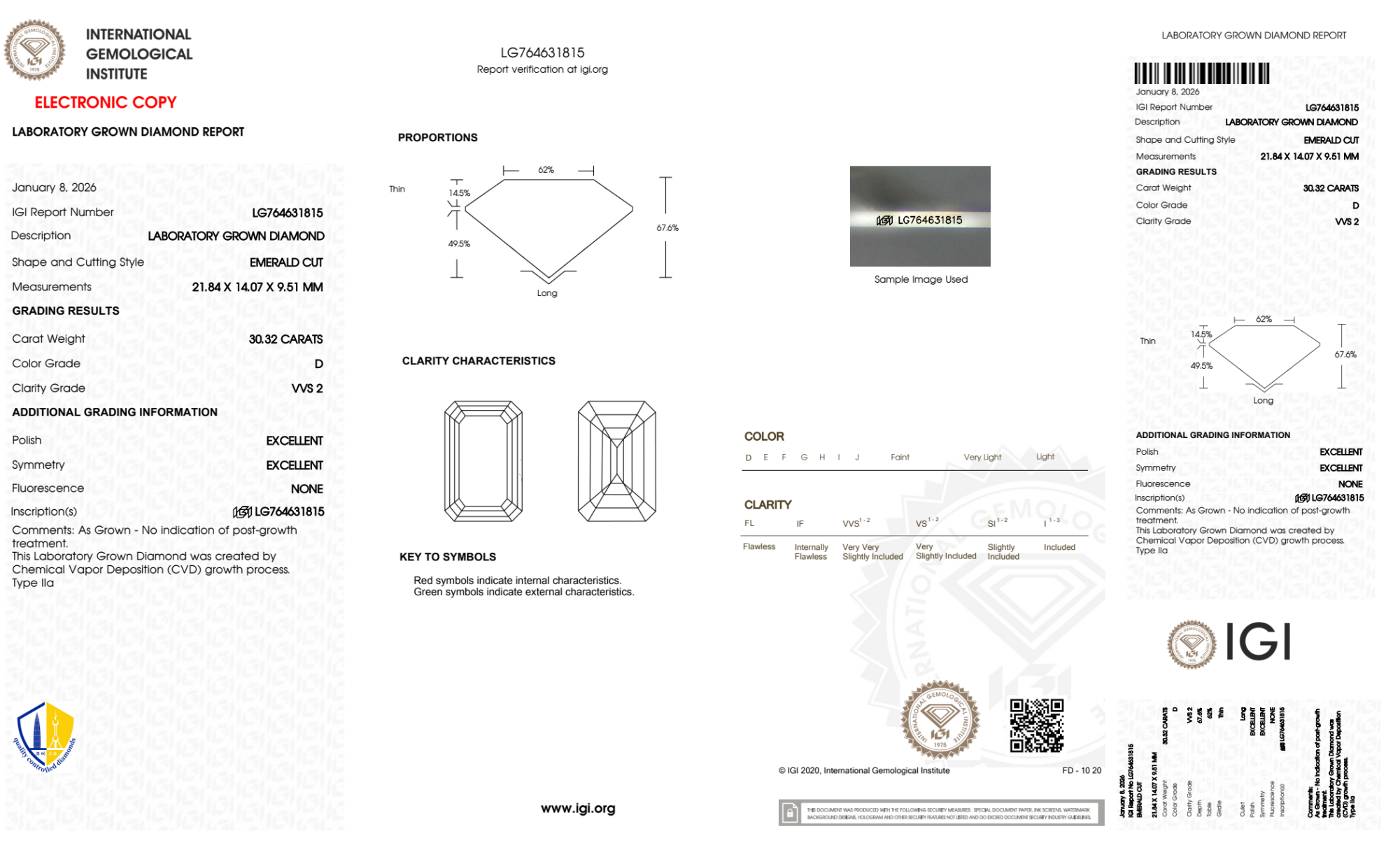 Your 30.32 carat Emerald lab diamond is graded VVS2 clarity, which stands for Very Very Slightly Included 2. Read more about VVS2 clarity diamonds here, or learn more about diamond clarity in general here.