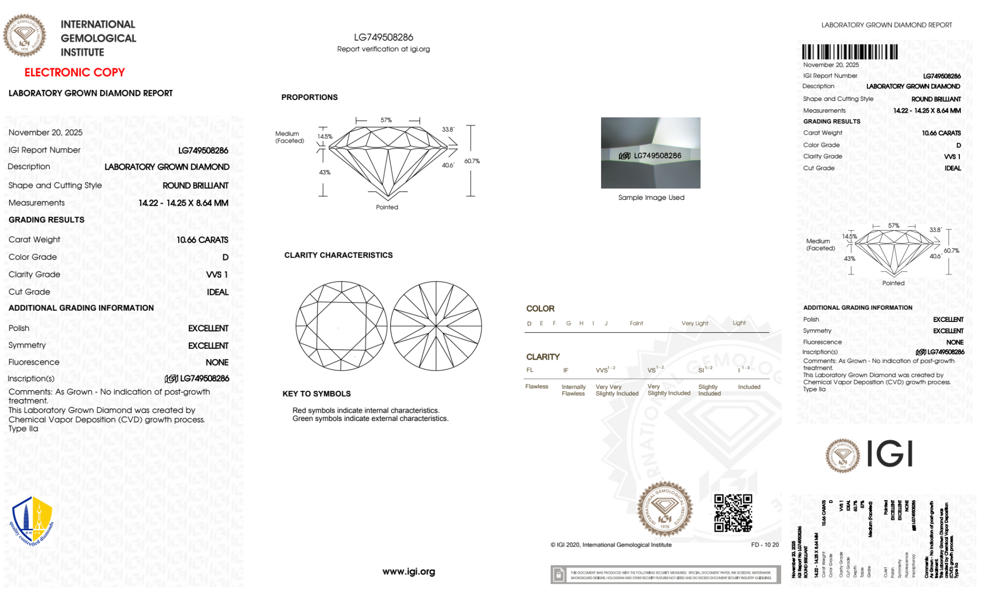 Your 10.66 carat Round lab diamond is graded D color (Colorless), and you can read more about D color diamonds here.