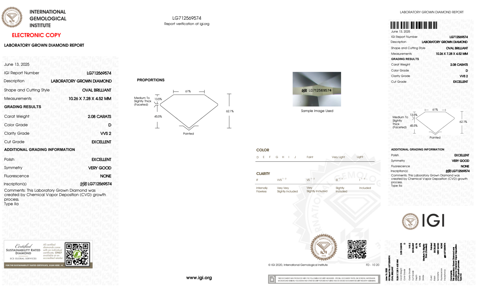 Your 2.08 carat Oval lab diamond is graded D color (Colorless), and you can read more about D color diamonds here.