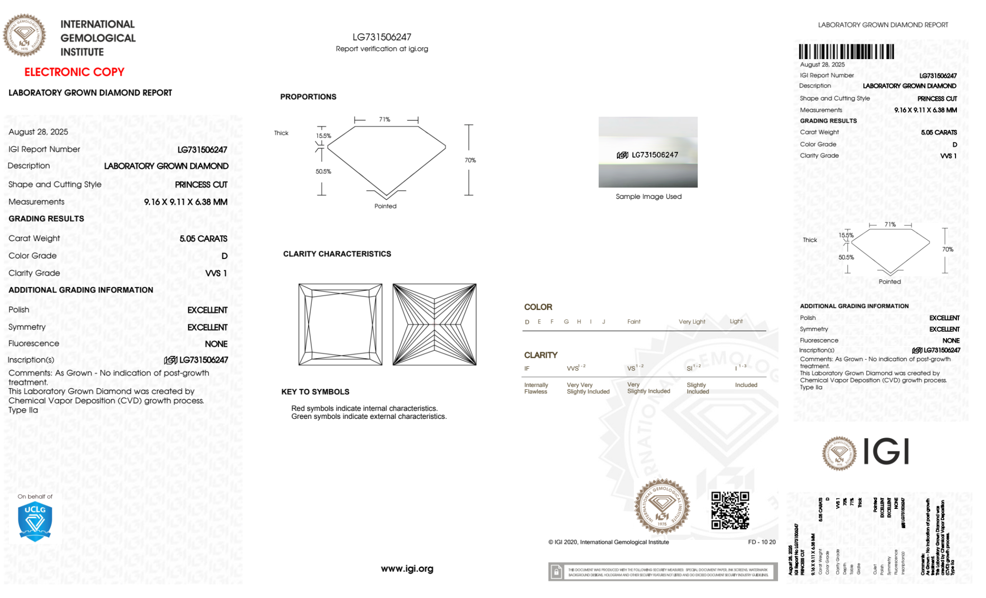 Your 5.05 carat Princess lab diamond is graded D color (Colorless), and you can read more about D color diamonds here.