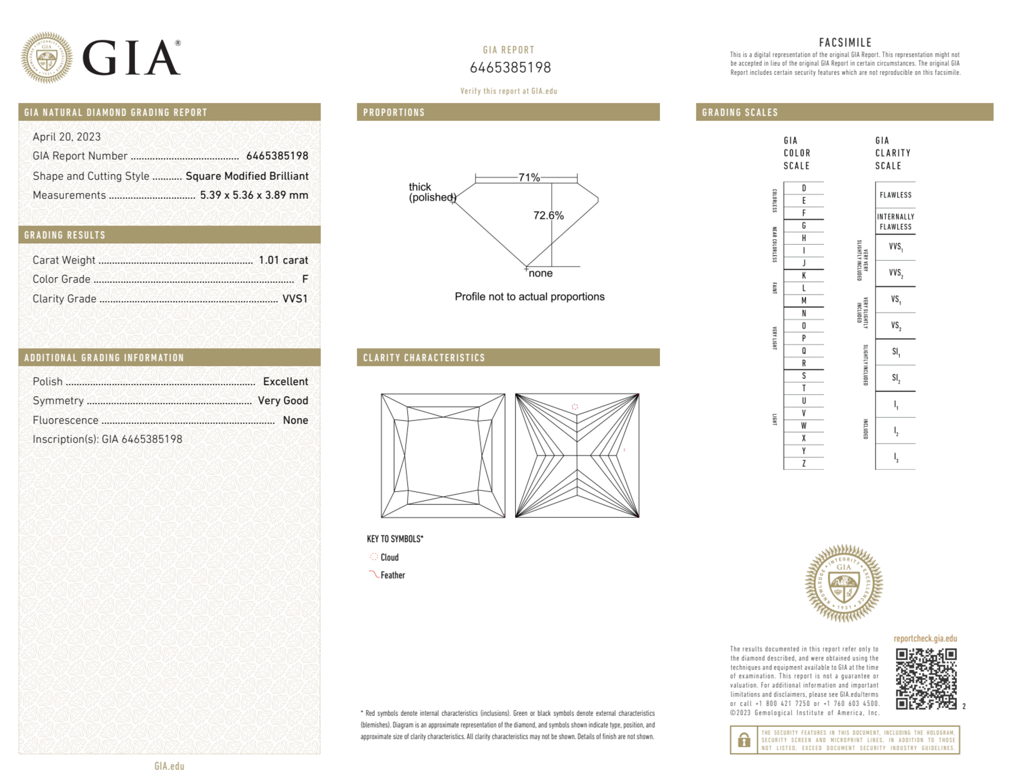 Your 1.01 carat Princess natural diamond is graded F color (Colorless), and you can read more about F color diamonds here.