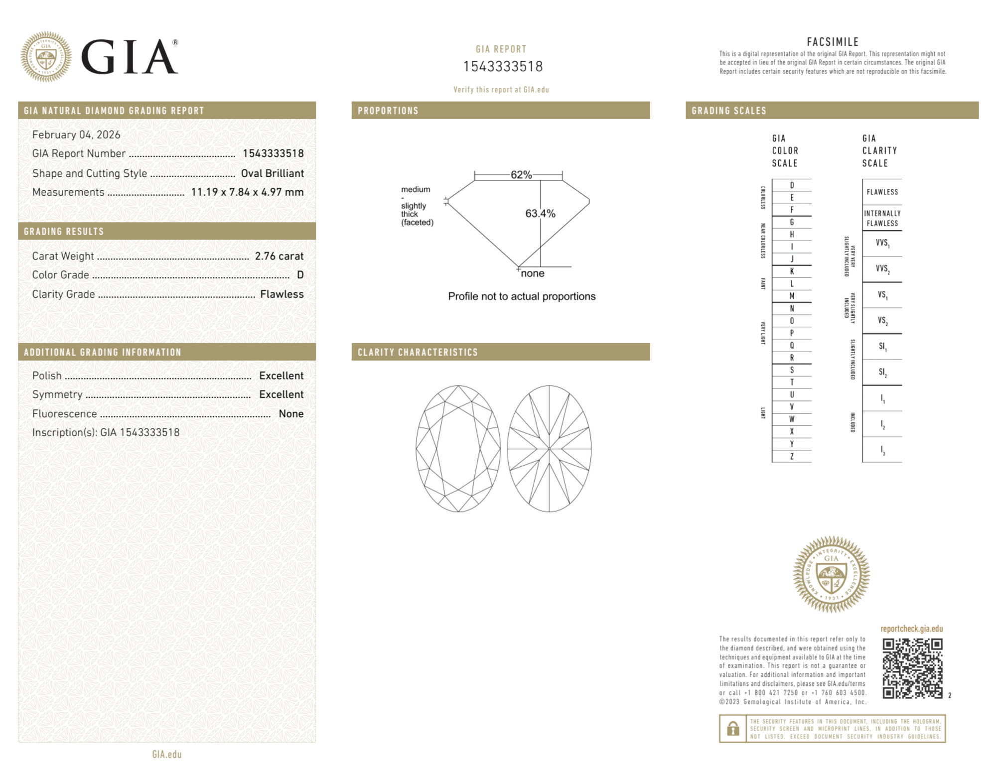 Your 2.76 carat Oval natural diamond is graded FL clarity, which stands for Flawless. Read more about FL clarity diamonds here, or learn more about diamond clarity in general here.
