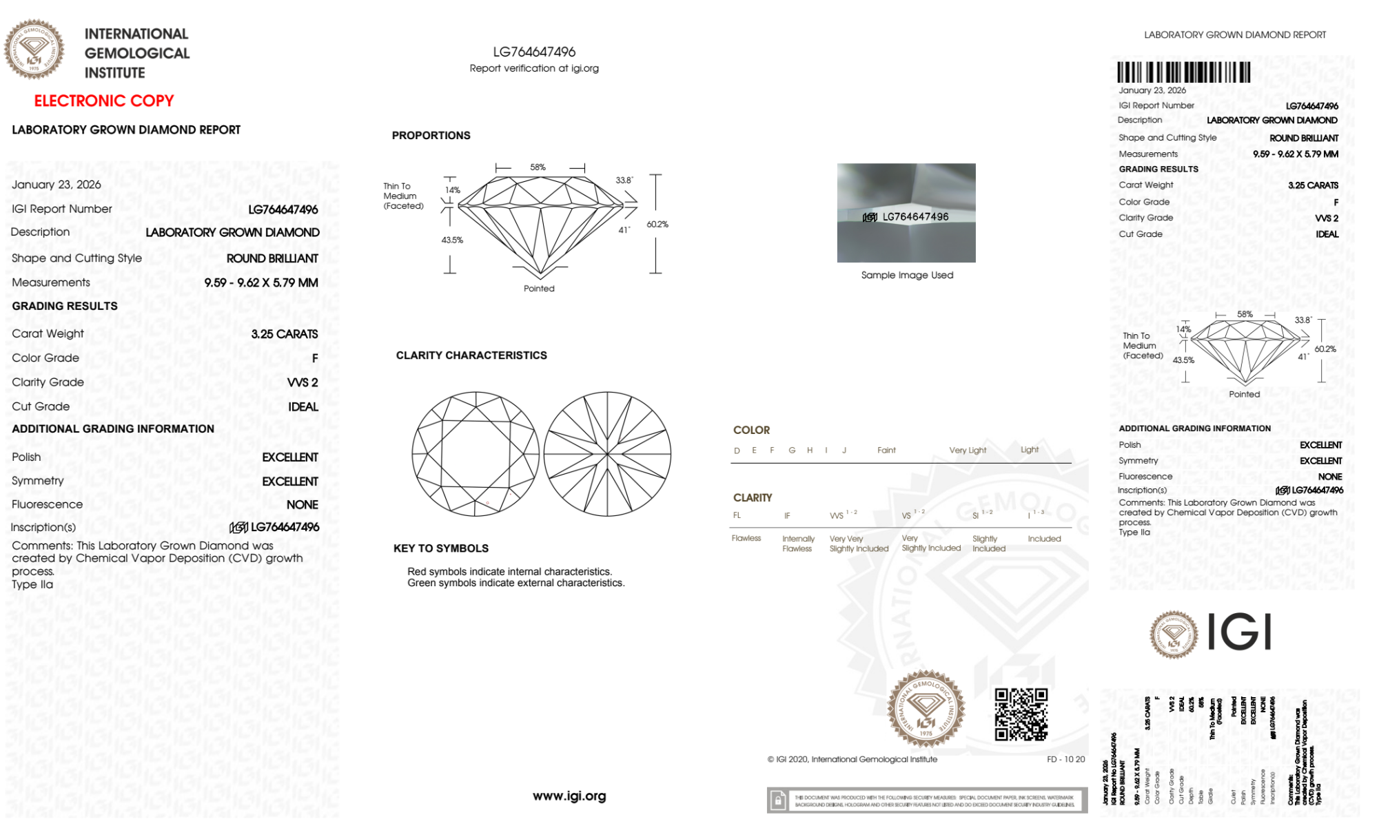 Your 3.25 carat Round lab diamond is graded F color (Colorless), and you can read more about F color diamonds here.