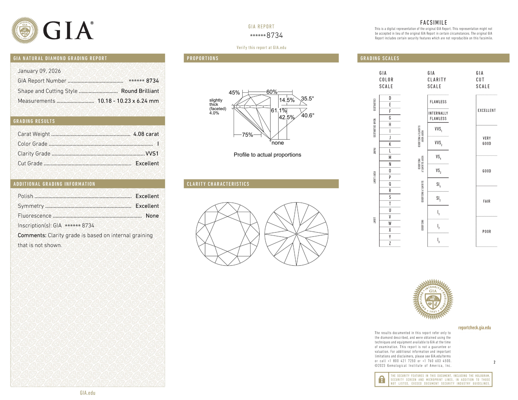 Your 4.08 carat Round natural diamond is graded VVS1 clarity, which stands for Very Very Slightly Included 1. Read more about VVS1 clarity diamonds here, or learn more about diamond clarity in general here.