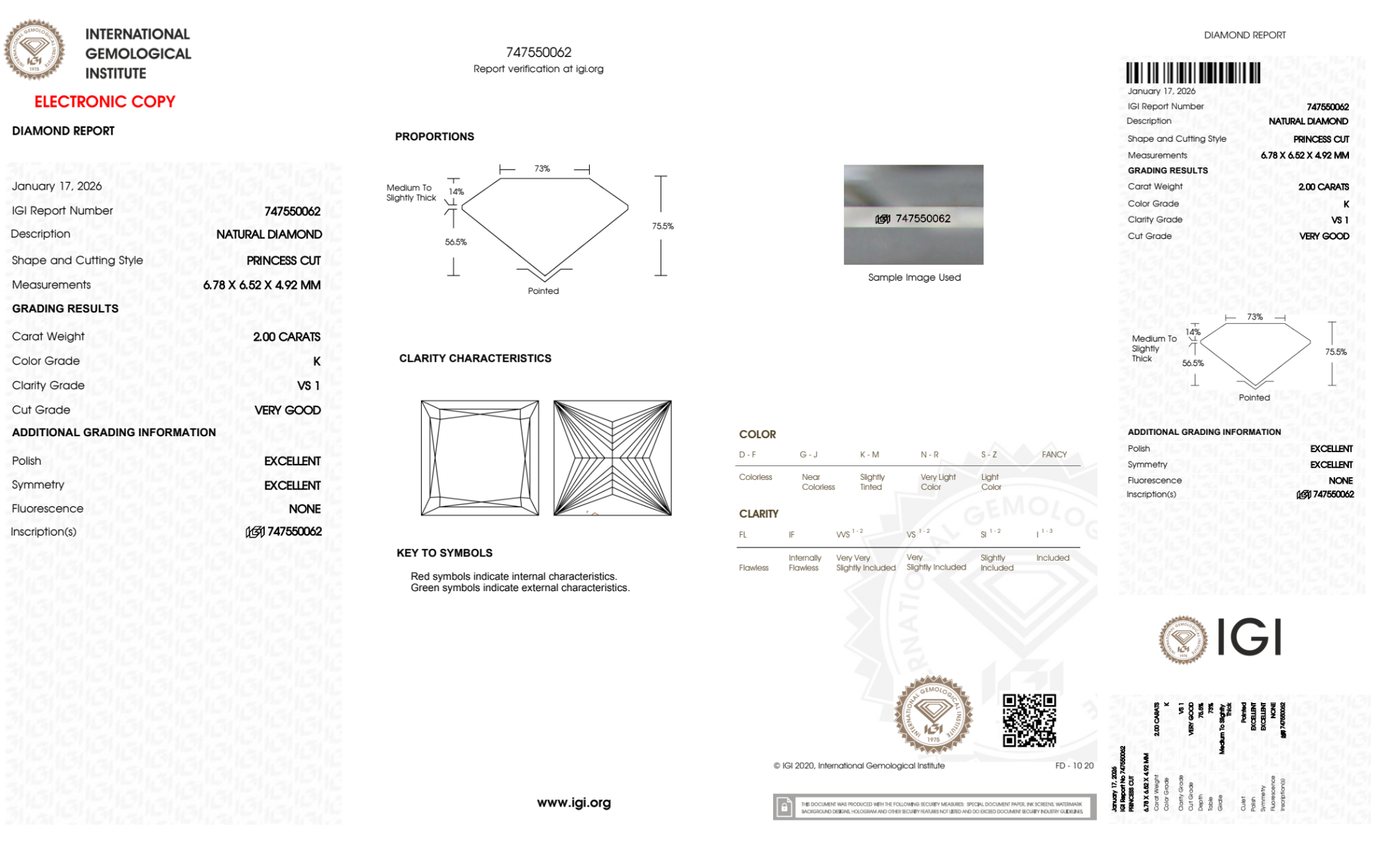 Your 2.00 carat Princess natural diamond is graded VS1 clarity, which stands for Very Slightly Included 1. Read more about VS1 clarity diamonds here, or learn more about diamond clarity in general here.