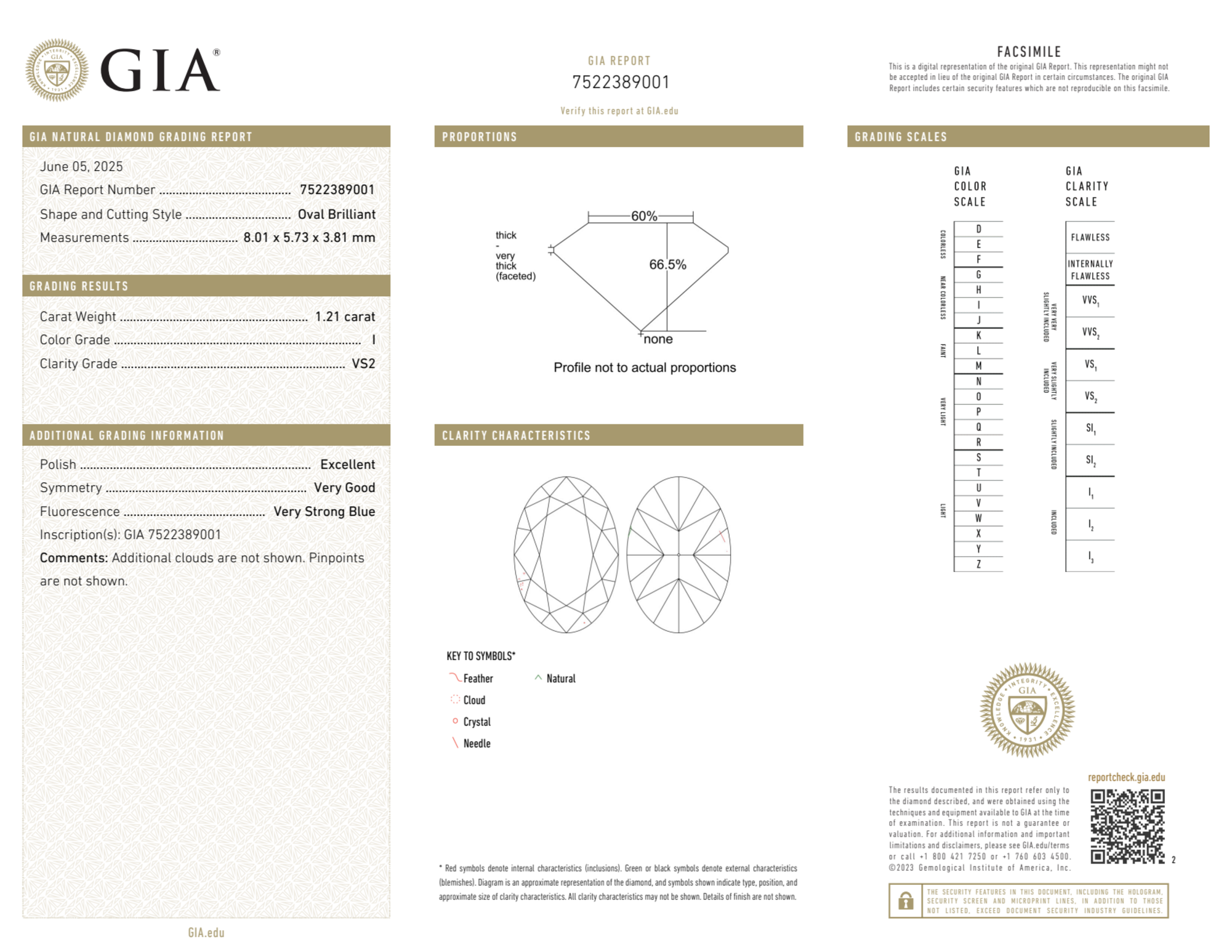 Your 1.21 carat Oval natural diamond is graded VS2 clarity, which stands for Very Slightly Included 2. Read more about VS2 clarity diamonds here, or learn more about diamond clarity in general here.