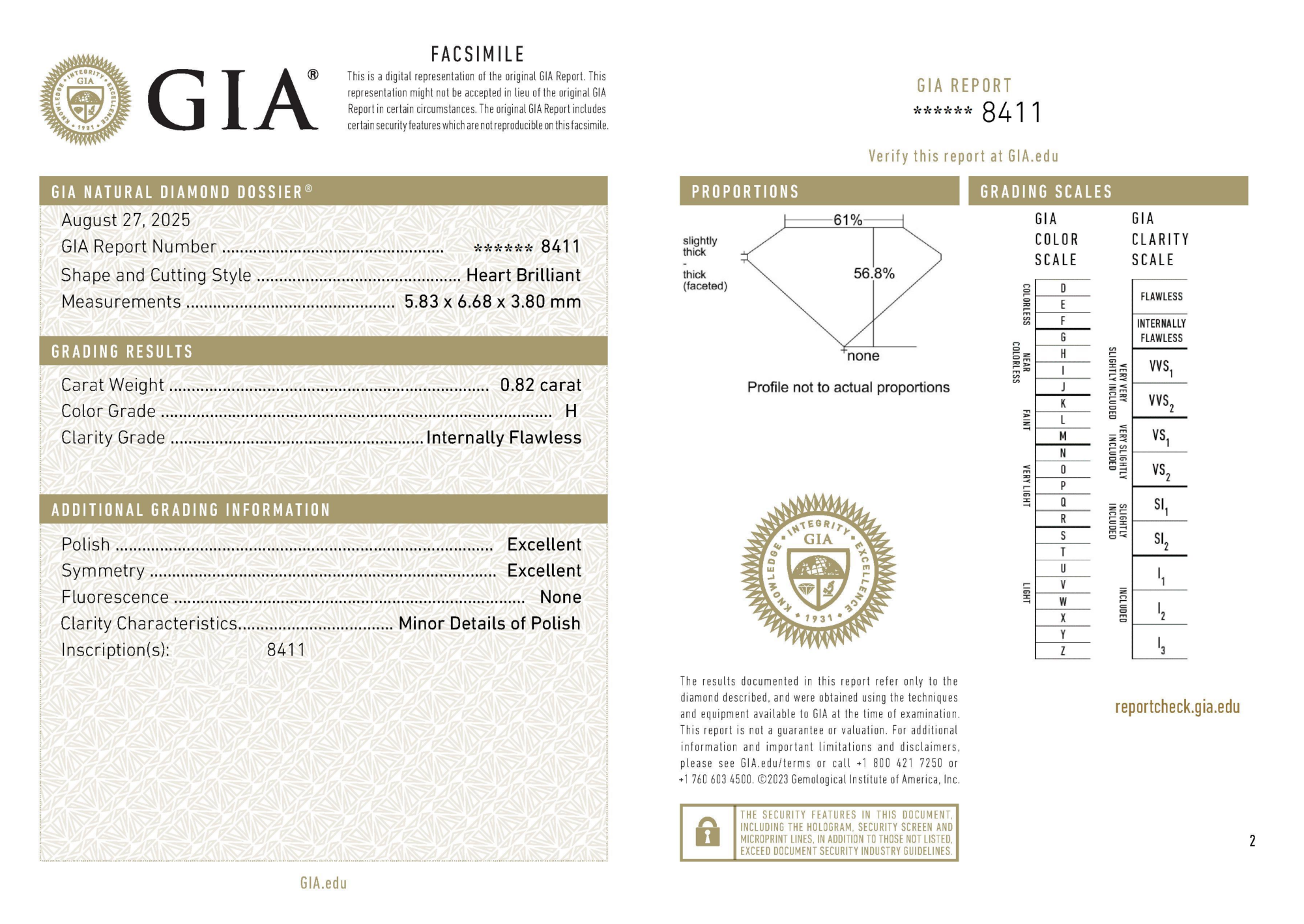 Your 0.82 carat Heart natural diamond is graded H color (Near Colorless), and you can read more about H color diamonds here.