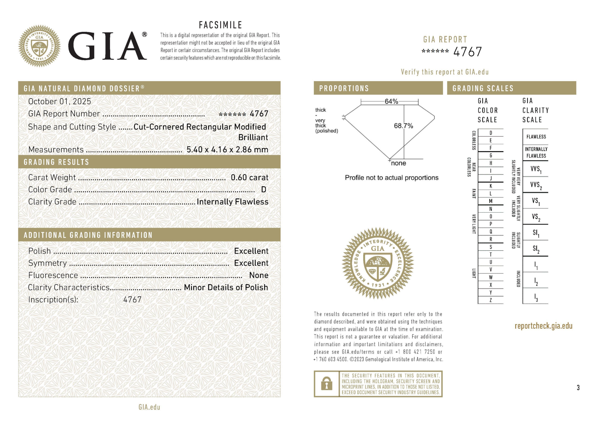 Your 0.60 carat Radiant natural diamond is graded D color (Colorless), and you can read more about D color diamonds here.