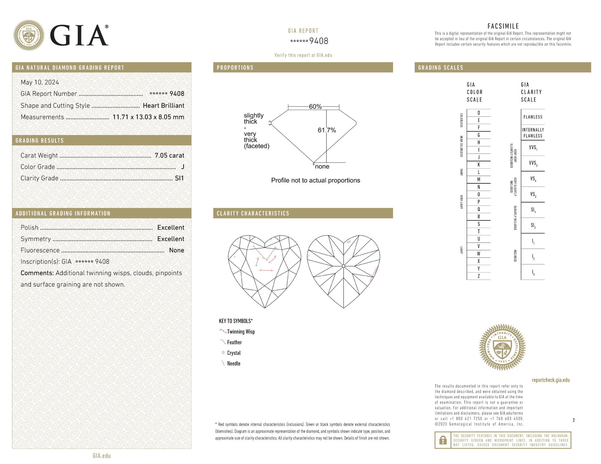 Your 7.05 carat Heart natural diamond is graded SI1 clarity, which stands for Slightly Included 1. Read more about SI1 clarity diamonds here, or learn more about diamond clarity in general here.