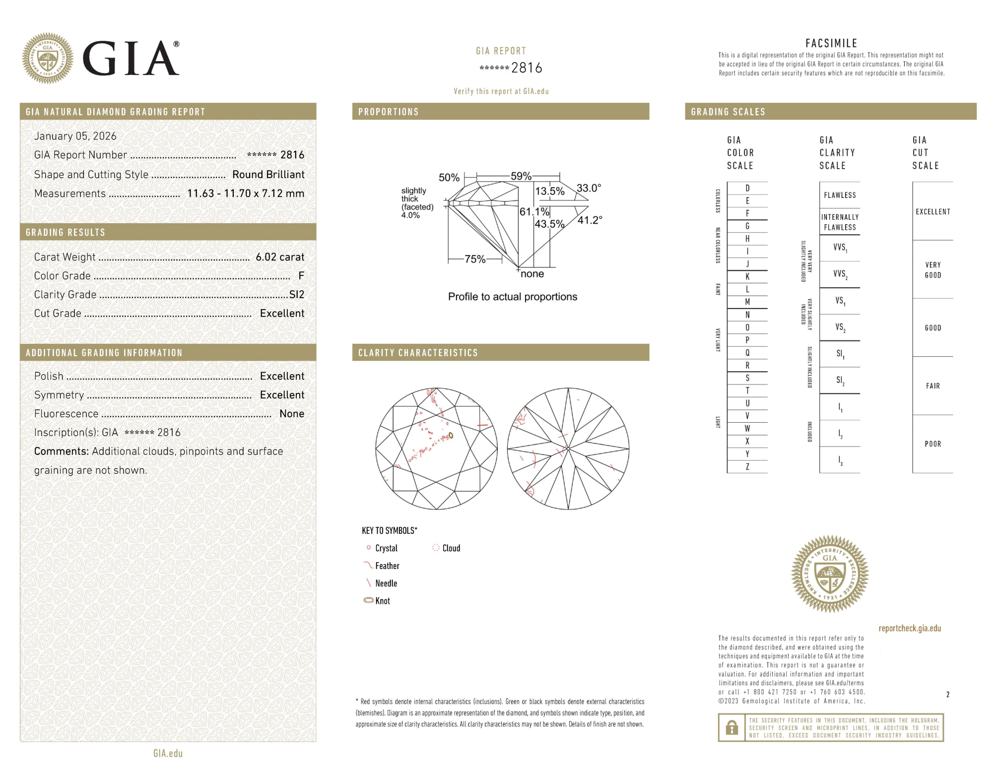 Your 6.02 carat Round natural diamond is graded SI2 clarity, which stands for Slightly Included 2. Read more about SI2 clarity diamonds here, or learn more about diamond clarity in general here.