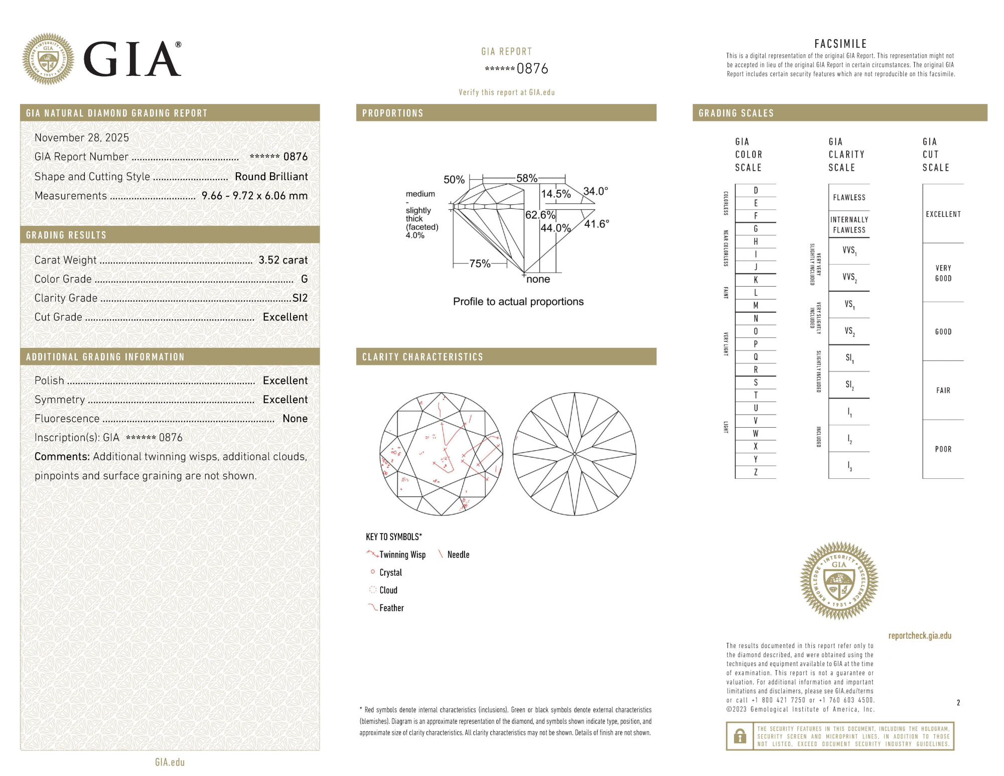 Your 3.52 carat Round natural diamond is graded SI2 clarity, which stands for Slightly Included 2. Read more about SI2 clarity diamonds here, or learn more about diamond clarity in general here.