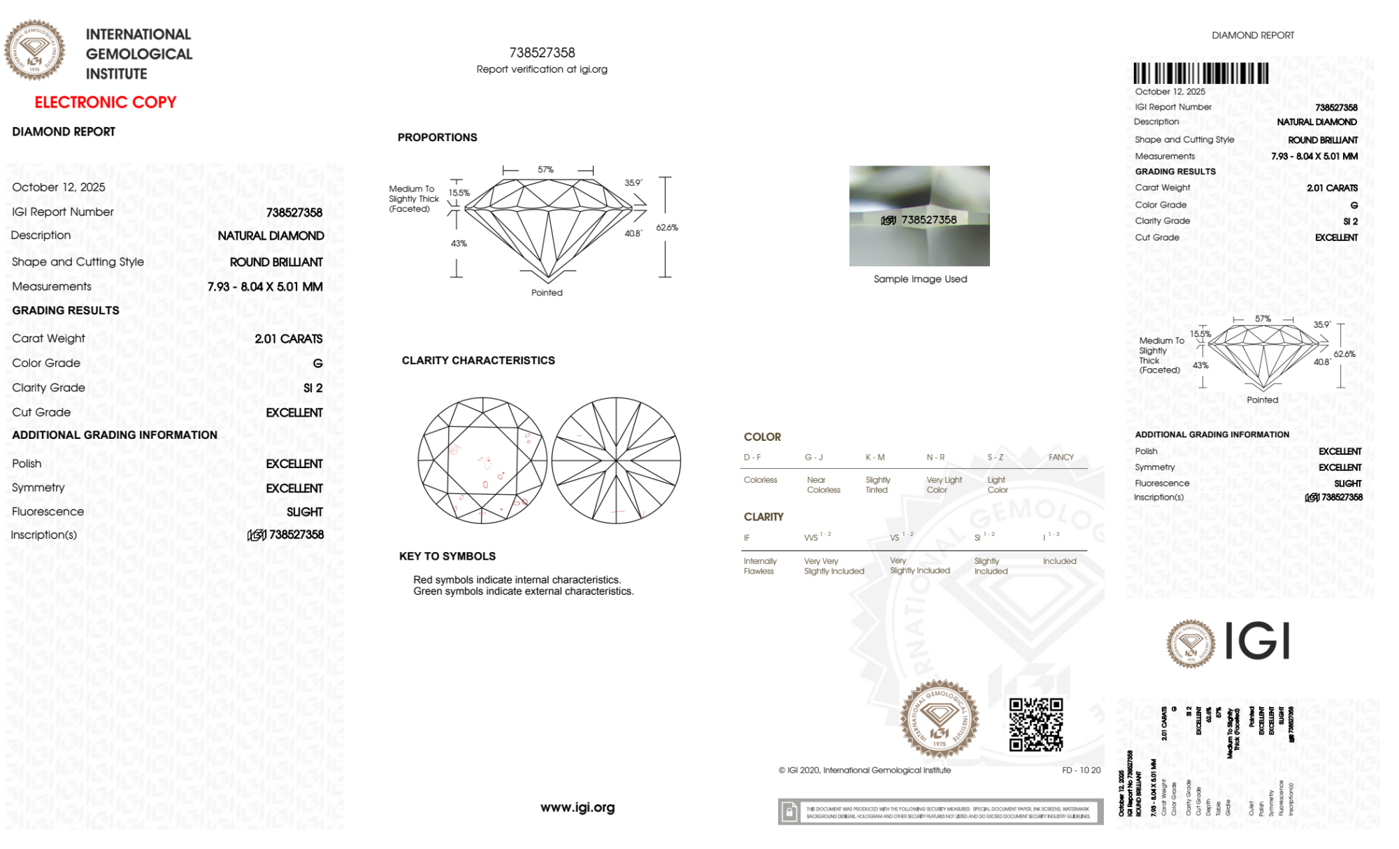 Your 2.01 carat Round natural diamond is graded SI2 clarity, which stands for Slightly Included 2. Read more about SI2 clarity diamonds here, or learn more about diamond clarity in general here.